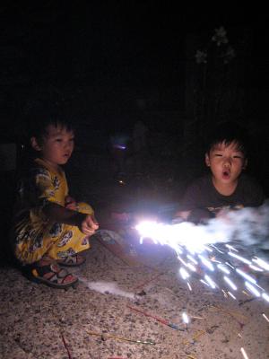今年は、毎週の様に「お祭り」に出かけた「いっくん」ですが、この夏を、締めくくる「お祭り」に従兄弟たちと出動しました。(私は、仕事で間に合わなかったので残念~)そして、お祭りの後、じいちゃん・ばあちゃんの家で、ミニ花火大会!※大満足の「いっくん」と「みーくん」気がつくと、「みーくん」が点火したまま放置した花火が、火を噴いています。(「いっくん(私も!)」超ビックリ!)※幸い火傷もなく、一安心です。(私も写真を撮っている場合じゃないのですが、たまたま構えてた時だったので・・・^^;)今年の夏も、そろそろ終わりです。ちゃんと「いっくん」の記憶に残っているでしょうか。 楽天トラベル宿泊予約/ツアー/格安航空券|高速バス予約便利でお得!温泉予約|東京ディズニーリゾート|ユニバーサル・スタジオ・ジャパン|朝食付きルームPuremiumプレミアムスペシャルセレクション高級ホテル・旅館予約「デジカメ情報サイト」へお越し下さいましてありがとうございます♪-セレブなあなたに-デジカメの最新情報はこちらからお買い得♪美味しい「お菓子」の情報はこちらのサイトへどうぞ!TOPページへ 楽天市場TOPへ 楽天広場TOPへ