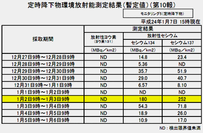 こちらは日常ブログですが、やや緊急事態なので、今日は武田邦彦氏のブログ転載記事を載せます。私の放射能ブログはこちらです。今からの転載はその前半です。全文はこちら。武田邦彦氏のセシウム速報・除染中に作業員死亡=2人目 こちらには、除染中に作業員死亡=2人目、放射線影響せず-福島というニュースも載っています。お時間のある方にはぜひ読んでいただきたいと思います。それでは武田氏のブログより転載します。セシウム速報 1月15日、セシウム降下物急増福島のセシウム降下物がやや落ち着いて来たと思ったら、1月15日に再び跳ね上がり、約200ベクレルを観測しました。「ゆるい警戒」を続けてください。範囲は宮城県南部から福島、茨城、千葉、栃木北部と考えられます。警戒は、風の強い日のマスク、洗濯物は取り込むときに叩く、外出から帰ったら玄関に入る前に衣服を叩く、そろそろ水道に出る可能性もあるので発表データに注意するなどです。子供は背が低いので、大人より被曝しますので、長期間の外の遊びなどはしばらく止めた方が良いでしょう。関係者は「地面に落ちたものが風で飛んだ」と言っていますが、すでに1月2日から2週間も続いていて、風の弱い日もありますので、不明です。ただ、200ベクレル(1平方メートルあたり)と言いますと、キャベツが4つぐらいが植わっている面積ですから、5日続くと新基準では出荷できないような降下量です。(降下量の測定は直径1メートルほどの平たい「たらい」のようなもので降下物を受けて測定していますから、野菜の上や川にも同じように降っていると思います。原因を花粉、風、4号機、雪、瓦礫の焼却、家庭ゴミの焼却など広くあたっていますが、今のところ「飛散している」のは間違いないのですが、その原因までは特定できていません。)発表が2,3日遅れるので、発表を待っていたら被曝します。その分だけ、やや注意をしてください。(平成24年1月18日) 武田邦彦日本から原発が消える日を願います。健康被害が最小限に抑えられることを願います。でも、利権者、権力者はそれを願わないのです。だからとても危険なのに大丈夫だと言い張るのです。セシウムが急増しても、住民に勧告さえしてくれません。日本の支配者は、原子力の未来を守りたいことが第一で、一般人の健康などどうでもいいから大丈夫だと言うのでしょう。---------------------------------- このブログにある情報は自由に拡散させていただいてかまいません。また、情報拡散のため、下をポチいただけると嬉しいです。情報におかしいところがありましたら、ご指摘いただけるとありがたいです。にほんブログ村