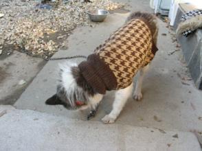 14日午後いなくなりました。雑種の中型犬 老犬(16歳) メス白と黒のぶち 目が見えません画像の服を着ています赤い首輪をつけていますくさりがついたままです保護してくださった方に1万円お礼いたしますその際は、掲示板に書き込んでくださいよろしくお願いします-------------------------------実は昨日、愛犬が行方不明になってしまいました。手を尽くしているのですが、見つかっていません。メリー(うちの愛犬)が歩き回れる範囲を広げるため、鎖の先に、長い紐をつけて、柱に結んであるのですが、メリーは目が見えないので、柱に紐がぐるぐる巻きになることがあり、見つけると、それを直すということがよくありました。昨日もお昼の1時半くらいに、ぐるぐる巻きになっていたので、いったんくさりを紐からはずし、紐のぐるぐる巻きを直した後で、くさりを紐につけたはずなのですが、きっとつけ方が悪かったんです。悔やんでも悔やみきれません。目が見えないメリーは、家を出て行こうなどとも思わないまま、どんどん歩いていってしまったのだと思います。帰れなくなってしまうなどと思わないまま。可哀想で仕方ありません。全部私の不注意のせいです。そんな危険性を予想していなかったんです。予想していれば、くさりがきちんとついているか、もっともっとしっかりチェックしていたのに。私は2時くらいに外出してしまい、外出先からスーパーに寄って、帰宅したとき、犬小屋を見もしないで、夕食を作り始めました。メリーにエサをやろうとして、いないことに気がつきました。2時に外出してから、長い時間が経っていました。早く気がついていたら、まだ近くにいたでしょうに。家族で手分けして夜10時半まで探しましたが、見つからず、明るくなればと期待して、今朝も探しましたが見つかりません。保護されて届けられているかもと、今朝、警察に電話しました。メリーらしき迷い犬の届出はありませんでした。特徴のあった犬がいたら連絡をいただけることになっていますが、まだ連絡はありません。保健所は日曜日はお休みでした。明日電話してみますが・・・。今朝、家の前に「犬を探しています」のはり紙をしました。チラシも作ったので、明日配るつもりです。メリーが無事に家に帰れますように。車にひかれたり、水に落ちたりという最悪なことが起きていませんように。