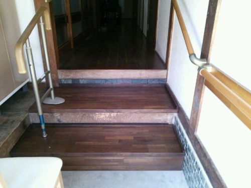 入口が3段になりました。 以前のは2段で、足が弱ったシュウトメちゃんが上れなくて困ったので、ブロックを敷いて、こんな感じでした。 印はリフォームする板の場所の目安です。 少しわかりにくいですが、廊下の右側の壁にずっと手すりを付けました。奥に見えるのは車椅子。 以前は壁に手すりはなくて、平行棒という歩行訓練機のような器具を廊下に設置していましたが、これ、案外使いにくかったみたいでした。 昨年の秋に蜂窩織炎で入院して、足が弱って退院しました。病院ではリハビリもしてくださったのですが、以前に戻るのは不可能で、この廊下が歩けませんでした。 急きょ、どうしよう?!とケアマネさんや業者さんに相談して、これならすぐに対応できますとのことで設置したものです。シュウトメちゃんは、その時には、車椅子には抵抗があったのです。 平行棒はレンタルだったので、返却するだけでした。 玄関右側の手すりはこんな感じになっていて、握ったとき、指になじんで すべりにくいです。 私が試しに段差を歩いてみたところ、かなり違いを感じました。 シュウトメちゃんはまだデイサービスから帰っていませんが、気に入ってくれると思います。