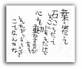この文章を書いた笹田雪絵ちゃんは、もうこの世にはいません。多発性硬化症(MS)という病気で闘病生活を送っていました。時間が経つにつれ、目が見えなくなったり、体が動かなくなる病気だそうです。彼女のことはネットで知りました。 彼女の書いたブログ「すのうレター」の「幸せ気分」より、少し転載させていただきます。(読みやすいように、勝手に行替えをしたり空間を開けたりしました。) ありがとうこの目が物をうつさなくなったら目に、そしてこの足が動かなくなったら、足に「ありがとう」って言おうって決めているの。今までみえにくい目が一生懸命見よう、見ようとしてくれて、私を喜ばせてくれたんだもん。いっぱいいろんな物素敵な物見せてくれた。夜の道も暗いのにがんばってくれた。足もそう。私のために信じられないほど歩いてくれた。一緒にいっぱいいろんなところへ行った。私を一日でも長く、喜ばせようとして目も足もがんばってくれた。なのに、見えなくなったり、歩けなくなったとき「なんでよー」なんて言ってはあんまりだと思う。今まで弱い弱い目、足がどれだけ私を強く強くしてくれたか。だからちゃんと「ありがとう」って言うの。大好きな目、足だからこんなに弱いけど大好きだから「ありがとう。もういいよ。休もうね」って言ってあげるの。多分誰よりもうーんと疲れていると思うので・・・。 (後略) 敵でないの (前略)MSだけど自分を愛していきたい、MSの雪絵をまるごと大好きでいたい・・というような事を言ったとき、即、MSと仲良くしてはだめ、MSは敵だよって言われました。でも私はMSと仲良くするし、私にとっては敵ではなく味方なのです。うまく説明できないけれど、私は決してMSに負けないし、負けたくないし、負けるわけがない。でもね、MSは私のために一生懸命がんばってくれてます、元気でいようとしてくれるけど、時々暴れてしまいます。でもその時も一緒によくなろうとがんばってくれてます。だから私にとって、敵ではないのです。MSの悪口を言われたとき、ちょっと悲しかった。病気になる事が好きなわけではない。けど、けど・・・友達にもうまく言えなかったけど敵ではないの。 身代わりシステム代われるものなら代わってあげたいなんて言われることあるけれど、世の中そういうシステムがなくて良かったと思います。だってもし私が誰かと代われるとしたら、誰にこの病気あげていいか分からないもん。たとえ犬にあげたとしても、その犬が今の私と同じようにしてると思うとどうしていいか分からず、その犬を一生抱っこしてあげなければ気がすまない。かといってアリにあげたとしてもやっぱり嫌。物語に出てくる働き者のアリだからしんどくてもきっと働くのだと思うのです。そんなの見てられない。毎日どうしてるかなって気になってしまう。私が毎日アリに砂糖を運んであげたい。ということで、この病気は誰にもあげられないのです。あげてもいいのにあげられないのもくやしいので、そういうシステムがないのには感謝してます。でも母に、もし目が見えなくなったら片目くれる?って聞くと喜んで「あげる」と言います。私の目はもらったりすることはできないけれど、それをお互い知っててそう言います。なんて答えるか知っててそう聞いて、そして期待通りの返事が返ってくると私はそれだけで充分満足なのです。誰かが私の代わりに病気をするのはちょっと無理。この病気は私にしかつとまらないわー。なんてちょっと大仕事をしているかのような私でした。 私、これでいいみたい学校を卒業してとくにする事もなくつまんないなって思ってた時期がありました。学生の時は学校に行くために、入院した時は病気を治すためにがんばってたけど、今は何をがんばればいいんだろうって。その時、自分のことを聞くのは嫌だったので、お年寄りの方を自分に置き換えて母に聞いたのです。どうして寝たきりのおばあちゃんのために皆がんばるのか?特に役に立つ事しないし、お世話も大変なのにと。これは本心で言ったのではなく、自分でも言いながら、なんて残酷なこと言うんだろうと思いながら。でも役に立たないし、世話が大変というのは実は自分のことだったのです。家にいても特に役に立っているわけでもないし、そしたら母の返事は「おばあちゃんはどうして年をとったか知ってる?」と言いました。子どもを一生懸命育てて、心配もたくさんたくさんしてきたのです。どんなに偉い人でも子どもの頃はあったのだし、その子を育てたのは親です。それを時には一人ぐらしの老人がいたり、老人ホームに入れられたり・・でもそれには仕方のない理由がきっとあるのです。それもわかっているのだけど、もし、役に立たないからという理由で、子どもが立派になったらはい、さよならでは、ひどい話です。自分を育ててくれた親だから、いっぱい心配してくれて、一生懸命働いて、ご飯作って・・・・。大切にしてあ