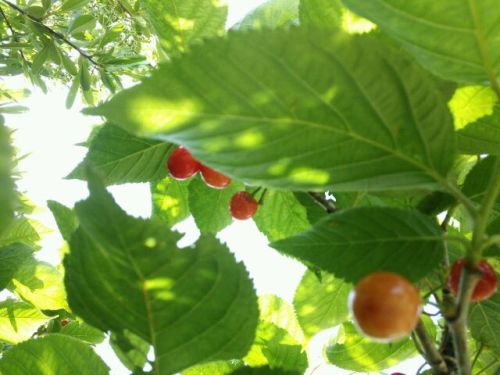 長女の小さかった頃、彼女の希望で植えたさくらんぼの木に、結構実がなっていて、可愛らしかったので、長女を呼びました。----------------------------------出勤前にシュウトメちゃんに「あの白い服がない」と言われ、「あの白い服」がイメージできないままに、あちこちのタンスを調べました。これかな?これは?と確認したけど、結局全部違うと言われました。本人は自分が着るから、自分の服のデザインを覚えていて、あの服が着たい、などと思うのですが、私は覚えていないんです。そもそもシュウトメちゃんの服の大半は私からのプレゼントです。ここ10年ほど、誕生日と母の日とクリスマスのプレゼントは、欲しいものをシュウトメちゃんに聞いて買っていますが、そのほとんどは服です。私が選んでいます。その服を着たシュウトメちゃんを見るし、選択して干すし、畳んで収納するのに、白い服」と言われた時点でも、白ならあれとこれと・・・などという風には、デザインが頭に入っていないのですよ。シュウトメちゃんには、その辺が納得いきません。興味ないんだもん。(←心の声)シュウトメちゃんの思いついた服がどんな服か、私にはわかりません。見つからなかったけれど、せっかく別室のタンスをかき回すのですから、今からの時期の、少し薄手のカットソーを15枚ほど出しました。シュウトメちゃんは自分の衣類管理をする気はありません。こうなると面倒くさいなぁって疲れた気持ちになります。----------------------------------何だか疲れたなぁと思いながら庭に出て、疲れたのに草取りなんか始めちゃった私の目に、最初の画像のさくらんぼが映ったのでした。一緒に木からもいで食べたら、甘酸っぱくて美味しかったです。お店で売っているものよりは甘くないけど、さくらんぼの木にありがとうと思いつつ食べる気分は格別なもの。長男は小さなころ、きんかんが好きだったので、植えたのですが、もう鈴なりでも見向きもされません。私はたまに食べます。風邪防止になるんですよね、きんかんって。キンカンの木の下には紫蘭が見ごろ。----------------------------------職場は賑わっていました。仕事から帰って、夕食を作って、ブログを書いて・・・。平和だなぁ。