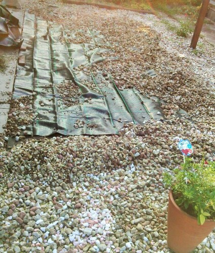 我ながらアホ~と思うのですが、腰が痛いです。土曜日に鍼とマッサージと日帰り温泉で軽くなった腰を楽に動けるわ~ とばかりに酷使して、今朝は腰痛。(爆) 実は作業途中で、ちょっとやばいかも?という感覚があったんです。その感覚に素直に従うべきでした。私の脳内には、過去の、こんなの全然大丈夫♪という記憶が膨大にありますからね、大丈夫じゃないの、これくらい・・・という脳みその声に従ってしまいました。ここで作業はいったん中止!と言ってくれた身体の声に従った方がよかったのにねぇ。 まあ、今朝はゆっくりと今から湯船につかり、腰痛体操でもして腰をいたわりましょう。13時から仕事がスタートできるようにもっていかなくては。 愛犬のいた部分は除草シートを敷いていなかったので、その部分のシートを敷いた上に石を撒きました。 庭の石は、最近は白っぽいものが好きになって買っています。 その前はもっとナチュラルな色だったので、混ぜないと全体として変。 これは以前のシートとの継ぎ目。ここに隙間があると、 そこから草が生えやすいので、多めにシートを重ねます。 色の違い、すごいでしょう?シートは、昔はもっと几帳面に、下の土の高さを揃えていましたが、小石で調節できるので、土の高さを揃える作業は割愛しました。 この色の違いは、かなり混ぜないと・・・。石の大きさも、最初は小石ばかりにしていましたが、上の方を大きい石にするようになりました。 石が多ければ多いほど、除草効果が高いです。雑草の種ってすごいんですよね。ホンの隙間から、土のある方へ行ってそこで根を張って成長します。 雑草は抜き、そうでないのは適当に生やしています。コンクリートと除草シートの隙間もに生えてきた花たちです。 この葉っぱたちに、赤い花が咲くか、ピンクの花が咲くか、どちらかな?