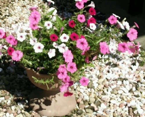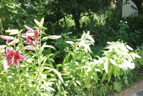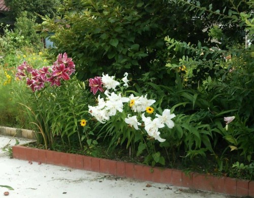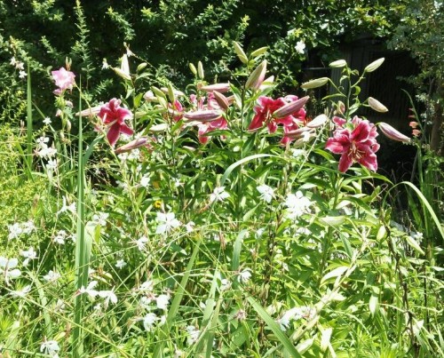 我が家の百合の第2弾が咲き始めました。第一弾の画像もあったはず・・・と思いましたが見つかりません。(苦笑)第一弾は透かし百合たちで、もうとっくに散っています。 山奥?って感じの画像ですが、うちは平野部です。(笑)この庭は、道に面している花壇なのですよ。春はチューリップがたくさん咲いて、そこそこきれいですが、今の時期は、白くて背の高いハクチョウソウが、この庭の暴れん坊将軍になっておりまして・・・ 。 この花は、これだけ固まって咲いているとなかなかきれいですが、頑健でどんどん増えてしまいます。15年くらい前に少しだけ植えたもの・・・なのですが。 頑健な仲間同士のツーショットです ローズマリーとハクチョウソウ これほど増えるものと知らず、背の高い花もあるといい感じ ♪と植えて、その後、父が末期がん宣告を受けました。13年前です。そのころは私はカメラ店でパートの仕事もしていたし、シュウトメちゃんも口うるさく手がかかり、子どもたちも中高生でオットは仕事が多忙という時期でしたので、超多忙な私は、庭など当然放置、 その間にどんどんハクチョウソウが増殖していったのでした。 そのうち整理しようと思いつつ過ぎ去る月日。(笑) シュウトメちゃんが見苦しいと騒いでいたものでしたが、根が深いので、枝を切りまくるしかなく、それも大変なんですよ。 今は施設にいるので、ハクチョウソウのことなど忘れています。ありがたいことです。(爆) ----------------------------------- 昨年植えたこの百合たちが、蕾も小さくて全然咲かないので、 実は今年は咲かないかもと半ば諦めていました。肥料をやらなければいけない時期に忘れていたのですよ。咲かないので、そういえば!と慌てて肥料をやったのですが、つぼみも小さくて。カサブランカだから遅いのかな?でもやっぱり肥料のせいかな? 前から植わっていた百合たちは、丈夫な品種なのか、アブラムシの駆除以外は、ほぼ放置でも、 つぼみが大きくなってきて、次々に咲いてくれたのですが、この百合たちはずっと小さなつぼみのままでした。 ごめんねぇと声をかけてきたのですが、このところつぼみが大きくなり、咲きだしてくれて、今見頃です。周辺が少々ワイルドですが 。(笑) こんなのも咲いています。 さて、道路の前に上の画像の庭があり、 雑草対策のためのコンクリートの私道があって、その奥に、また庭がありますが、これは奥の庭の画像です。ここにも百合が植えてあります。 こちらは柿の木、さくらんぼの木、キンカンの木などの陰になることも多く、最初の画像の百合とは環境が結構違います。こちらの方が百合向きかも?昨日撮影したこの百合、まだつぼみですが、咲いてくれそうな感じでしょう。それがね、今朝、咲いていたんですよ~。 最初の画像と同じような百合ですけど。お隣の白のカサブランカはまだ咲いていませんが、明日か明後日には咲きそうな雰囲気で、楽しみです。 今日もアゲハチョウが遊びに来ていました。ランタナの花にとまっています。 ここはまた違う場所ですが、白の小さめの品種のペチュニアを植えました。最近、庭の話ばかりね。(笑)