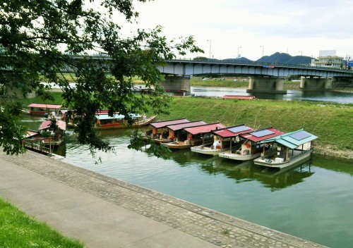 日帰り旅行記最終です。 川辺の方に向かっててくてく歩いていくと、鵜飼の屋形船が並んでいました。 ここで屋形船にお客様を乗せて、右側に見える本流に出るんですよ。 わかりにくいですが、三重塔の近くまで歩いたので一枚撮影。 駐車場近くの遊歩道を歩いてみました。ロボットの大きなオブジェが目立っていました。ここをまっすぐ進んで行くと、なんと最初に歩き回った川原町の裏道の間の広場に着いたのでありました。 鵜飼船に乗ったわけではなく、うかいミュージアムで写しました。19時閉館で18時少し前に訪問したためか、大きな施設が貸し切り状態。親切な館員さんが、 ガイダンスシアターがもうすぐありますからと待ち時間の間、鵜飼の話をいろいろしてくださいました。 なんと館員さんのお父様は船頭さんをなさっていたとか。館内からは長良川が見渡せて、船が行き交うのも見られます。館員さんは、通り過ぎる船に乗っている鵜匠さんのお名前や年齢までわかるのでした。 すごい。 いろいろ豆知識が仕入れられるミュージアムで楽しかったです。画像は織田信長が武田信玄の使者を鵜飼でもてなしたという話。 鵜飼の歴史は古いのであります。 うかいミュージアム館内から、すぐ外に出るとこんな景色が。手前の土手を少しの階段で超えると、中庭があり、その向こうに道、長良川、山があります。 館員さんに教えていただいたのですが、奥に泊まっているのはトイレ船だそう。トイレが必要な船はここに寄って用を足すんですね。 地元の日帰り温泉に入って、軽い夕食もそこで食べて帰宅しました。この「喜多の湯」は地元に近い名古屋にも 確か4店舗ありました。岐阜にもあるとは知らなかったです。 この日帰り旅、行動範囲はとても狭かったのですが、久々にかなり歩いたので、 温泉もことのほか心地よかったです。 日帰り旅なのにその5まで引っ張ってしまってごめんなさい。 長らくお付き合いいただきありがとうございました。 夏休みが始まってすぐの3連休、今日は最終日です。 職場は今日も賑わって忙しいことでしょう。 皆様にいいことがたくさんありますように。