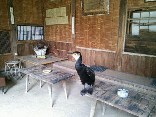 鵜の庵 鵜は、昭和の雰囲気の喫茶店。私たちはアイスコーヒーをいただきましたが、こちらでも鮎の塩焼きや鮎雑炊がいただけます。 アイスコーヒーが運ばれてきた窓際に鵜が見えたので、撮影してもいいですか?と伺うと、中庭に入って写していいよとのこと。もうすぐ鵜をしまうから、その前に見てくるといいよって。 鵜をしまう??実はこの庭から見える鵜たちは、半数は今夜の鵜飼で働き、半数はお休みなんですって。この喫茶店が4時閉店なのは、4時にはもう鵜はしまわれて、鵜を見たくて来るお客様が見られなくなるからだとか。 早速専用のドアを通って、鵜の近くに行きました。 こんな至近距離で見られるなんて。羽がつやつやしていて、きれいな鳥した。 左側が鵜の小屋になっています。小屋にいるのも小屋から出るのも鵜の自由。 思い思いに寛ぐ鵜たち。近づいても逃げません。 小屋の中にもかごがありますが、ここにも。後で見ることが出来ましたが、このかご1つ1つに鵜をしまうんですよ。 小屋の入り口です。中は関係者以外立ち入り禁止。 アイスコーヒーのある席に戻ったら、鵜が近くに来てくれました。左端に写っているのは友人で、心霊写真ではありません。(笑) 鵜をしまう作業が始まりました。これはわかりにくいけど、首を持っているところです。まず鵜の首を持ちあげて、次にお尻のあたりの羽を持って鵜を逆さにしてひゅっとかごに入れていきます。 この作業の様子がとても面白くて、友人と見とれていました。この時間、喫茶店の客は私たちだけなので、あっ、首を持った!とか、かごに入れた!とか、周囲に気を遣う必要もなく、私たち、盛り上がりっぱなし。 鵜はかごに毎日こうして入れられるわけなのですが、やはり入りたくはないらしく、ちょこちょこっと逃げたりするんです。それを追いつめてさっと首をつかまれると、もう観念するようで、かごに入れられた鵜が暴れてかごが揺れるんじゃないかと微かに期待した(?)私たちは「暴れないんだ~」と鵜に感心。 最期になった鵜は、やはり少し抵抗して逃げていましたが、最終的にはなんと、首をつかまれることなく、自分からかごに入りました。思わず「おお!」と声が出ちゃいました。「可愛い!」「わかったから、かごに入るから、首つかまないで」っていう感じ?」すっかり鵜の可愛さに魅せられました。 この喫茶店に3時くらいに行くと、しばらく鵜を観察で来て、鵜がかごにしまわれるところもばっちりみられると思います。調べて出かけたお店ではありますが、こんなに楽しい所とは。 日帰り旅行記はまだまだ続きますのでよろしく~。