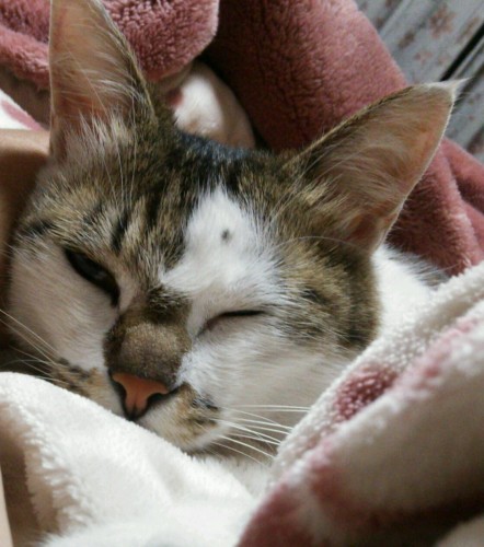 4日にシュウトメちゃんを施設に送っていって5日に施設から、盗難被害妄想の件で電話があり6日にフクちゃんが死んでしまい、一晩家でフクちゃんの遺体と過ごし7日にフクちゃんを火葬場に連れていき8日には、普通に家事と仕事をこなすのが精いっぱいで・・・ついついシュウトメちゃんの所に顔を出すのをさぼっていました。昨日9日に、やっとシュウトメちゃんの所に行きました。施設へは、着替えも飴もお煎餅もたくさん置いてあるし、来ないなと思われることはあっても、困ることはないと思っていましたが、その通りで、シュウトメちゃんは、穏やかな顔をしていました。困ってなかった?と聞くと、困ってた、と言いましたが、それはズボンを盗まれたとかいう話ではなくて、眠るときに寒くなったので、もう1枚毛布が欲しいということでした。いつもなら、これが欲しいと思うものがあると、家に電話してきたものですが、たまたま不在だったのか、それ程困っていなかったのか、遠慮するようになったのか。目の前にいるシュウトメちゃんは、昔より一回り小さくて、年を取ったんだなと改めて感じました。お正月の時、上の義姉が、今度はまた来年のお正月にと言ったのに対して思わず上から目線で、なんて薄情なと感じたものでしたが、ふいに、きっとその方がいいんだと感じました。薄情とは違うんだと思ったのです。母親と価値観が違っていて、共感しにくい友人がいます。彼女は母親との溝を埋めたくて、いろいろ試行錯誤しましたが、溝が埋まらないのを受け入れるしかないことを悟りました。彼女も彼女のお母さんも、母が、娘が、大事なんです。でも、2人の溝が狭まることがないことを自覚するのはきついこと。きついけれど、それはその人に必要だから起きてくること。苦しいのに、無理をして、必要以上にその痛みを頻繁に感じなくてもいい。シュウトメちゃんと義姉たちもきっとそうなんだいう思いが、小さい老人となったシュウトメちゃんを見て、不意に強くわきました。大事だという思いと、わかり合えないという現実があるとき、その関係を自分の中に受け入れ、消化していくのは、そうでない関係の母娘には理解できないほど大変なはず。それが理解できないくせに、自分の母親なんだから、もっと顔を見せてあげればいいのになどと上から目線で見ている義妹koalaが、うざいのは当然ですね。おまけにその義妹が全部世話をしているという弱みがあって、その弱みは義姉たちの罪悪感を無意識下で刺激することでしょう。罪悪感なんて必要ないと言い切るためにも、自分のルーツを相手の中に見出さないためにも、離れていたほうが平和という関係だってあるのです。自分は罪悪感を感じているんだなと、少し離れたところからその罪悪感を見つめて、認めちゃった方が楽になるだろうと感じましたが、そんなのも余計なお世話。余計なお世話というのはうぬぼれた上から目線かもしれません。罪悪感を感じさせる母親シュウトメちゃんと義妹koala。母親は愚痴ばかり言っている。義妹はうぬぼれた上から目線で見ている。これは顔を見るのも声を聞くのも不快で当然。不快さをぶつけられてしまうシュウトメちゃんとkoalaもこれまた不快で当然なのでありました。当然なのとそれでいいというのはまた違う問題ではありますが、少なくともそれは義姉とシュウトメちゃんの問題であって、私が「お盆も来てくださいね」などと口をはさむことではなかったと、言っちゃったものは仕方ないですが(苦笑)、すとんと腑に落ちました。あんた何様?と自分突込みでもしておきましょうか。シュウトメちゃんが義姉たちを愛しているように、義姉たちだって、シュウトメちゃんを愛しているんです、多分。でもねじくれた関係なので、愛がある分、苦痛も強いのかもしれません。今まで出しゃばってごめんね。最後に、今日のフクちゃん画像。やっと泣かないでフクちゃんの画像を見られるようになってきました。まだ泣くこともありますけど、今、この場では泣いていません。(笑)私の抱っこで、眠りに落ちていく直前のフクちゃん。この顔を見て、別れは悲しいけれど、これでよかったんだと思えました。フクちゃんが野良猫ちゃんのままだったら、こんな安心した表情で暖かな毛布の中で、飼い主の愛情を感じながら、眠りにつくことはなかったのですから、あまりにも短かったけれど、フクちゃんはいい一生を送ったのです。安心なこと、暖かいこと、愛されることは気持ちいいことだったね、フクちゃん。目が見えなくなっていた高齢の愛犬メリーちゃんを家族が散歩に連れていくと、その後を隠れながら(丸見えなんだけど)下手なスパイのようについてきたフクちゃんの姿を思い出します。よくフクちゃんを抱っこして「可愛い、可愛い」と言いました。フクちゃんは、プライドの高い女の子の猫だったので、たまにしか甘えてこなくて、「可愛い、可愛い」と抱っこしても、そのうちす