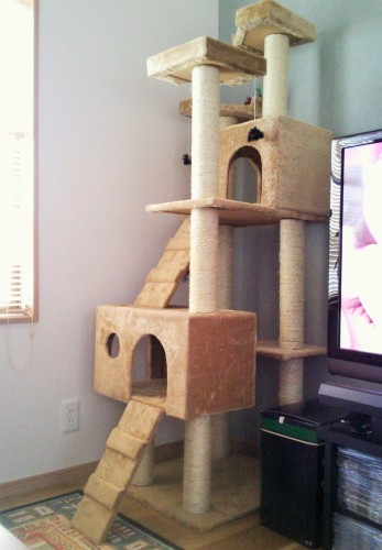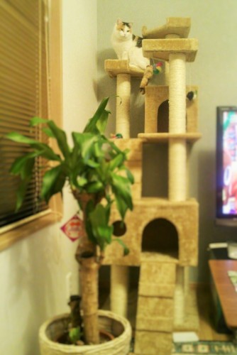 この画像の中にナナちゃんがいます。どこでしょうか~?(笑)うふふ。高い所に上がってましたね、ナナちゃん。上の画像では目が写っていなくて、別の画像です。タンス横の本だなの上に飛び乗ってから、タンスの上に乗るのです。フクちゃんは高い所がだいすきだったのに、ナナちゃんは上がらないねぇと言ってたら・・・やっぱり猫って高い所が好きなんでしょうね、いつの間にかお気に入りスポットに。寝室には毎日行くようになりました。他にもベッドの下がお気に入りスポット。ベッドの中に入ってきてほしいけど、次の冬居間ではキャットタワーでよく遊んでいます。いろいろアクロバットな体勢を取るので、さかさまになったりして、時々落ちそうになるナナちゃんですが、爪でがしっと爪とぎ柱をつかんで、体勢を立て直します。あまり爪切りをしてはいけないかも。(笑)ちょっと疲れました、という風情。見飽きないです。最近は「遊ぼう~」と呼びに来てくれます。抱っこは嫌いなんだけど、遊ぶ相手にするのは好きみたい。でも、私、そこそこ忙しいので、長いこと付き合えないの。私の都合のいい時間に向こうが誘うというのもないんですよね。まあ仕方ない。