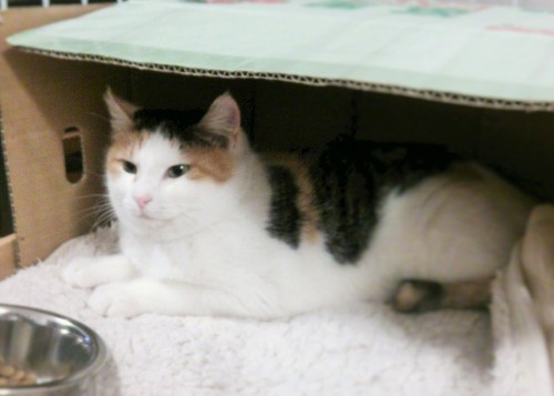 浅草ねこ園浅草ねこ園ブログ里親募集中!東京都台東区浅草3-1-1 馬道妙見屋ビル6階--------------------------------------------------------------- 「野良猫を保護して猫カフェをやっている知人がいます」と浅草ねこ園を教えてくださったのは、ステップマザーさん。 遠くてちょっと行けないけれど、ご紹介だけさせていただきます。猫園児たちの画像はこちらをクリック→ 画像&紹介文福島の人が住めない地区で、飢えと寒さの中生き延びている猫を保護している方々がいらっしゃいます。4年前のあの日まで、平和に暮らしていた猫ちゃんも多いでしょうし、その後に野良として生まれた猫も多いでしょう。浅草ねこ園では、福島から保護された猫たちを引き取り、里親探しをする活動をしておられます。里親さんにはなれないけれど、一時預かりできるという方も募集中です。---------------------------------------------------------------猫に限りませんが、たくさんの動物が、環境の激変の中で、死んでいったり、耐えて生き延びたりしている世界は、遠くのよその国でなく、本当にすぐそこにあるんだなと思いました。いま、外ではあられが降ってきました。福島はどんなに寒いかと暖かい部屋で想像するだけの私。ナナちゃんは、ゲージの中で寛いでいます。外にいたら、すごく寒かったんだよ、ナナちゃん。---------------------------------------------------------------ナナちゃんはまだ警戒心があり、基本の居場所はゲージの中ですが、時々ゲージから出てきて探検し始めます。何かに驚くと、またさっとゲージに戻ります。ウンチをすると鳴いて教えてくれます。掃除して~って思うんでしょう。淋しいときも鳴きますし、外に出たいよ~とも鳴きます。ゲージの中で撫でると、気持ちよさそうにゴロゴロ鳴きます。お腹を見せて撫でて~という体勢がビビリに見えません。(笑)頭をこすりつけて甘えてくるので、根は甘えん坊なんだと思います。どうして保護されたのか理解できないし、怖いんでしょう。野良ちゃんのたまり場で生まれ、そこに住んでいました。餌を与えるけど飼わないし避妊もしない人たちに可愛がられていました。いつの日にか、付近住民のどなたかが耐えかねて、捕獲してくださいと通報されたら、真っ先につかまりそうな猫に見えたので、見かねた猫好きの方が、捕獲して保護してくださったナナちゃん。窓際で訴えるように低い声で鳴くナナちゃん。本当は、慣れ親しんだ住みかのすぐ近くで飼われて、暖かい寝床と餌と可愛いと撫でてくれる飼い主さんがいたら、ナナちゃんにはベストだったと思います。でもいなかった。だから遠くに連れてきちゃった。私はナナちゃんを救ったわけじゃなくて、ナナちゃんの看守になったようなものかもしれません。せめていい看守になりたいよ。人間にも猫にも、運命の激変ってあるんですよね。