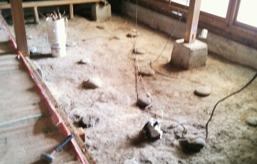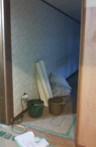 シュウトメちゃんの部屋の入り口は1メートルになりました。やはり車椅子で入るためには、これくらい欲しいです。やり直してくださった大工さん、ありがとうございました。中は今こんな感じ。部屋らしくなってきました。暗かったので、くっきり見えませんので雰囲気だけ感じてください。(笑)中央にあるのは、クロス貼りの道具です。こんな風だったのですよ。ふすまの前が廊下になり、廊下の手前に壁が出来て上の部屋に。左側に見える柱の部分から右は部屋、左は廊下に。無事、形になってくると嬉しいです。まだトイレ工事が残っています。