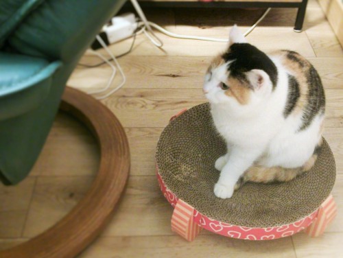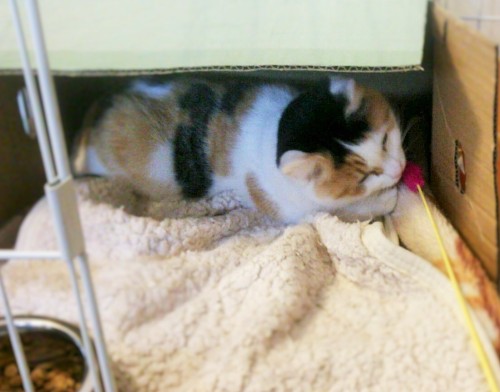 ナナちゃんは基本、ゲージの中に引きこもっています。でも、毎日少しだけは部屋の探検もします。爪とぎ台の上にいるナナちゃん。 手前はオットのリクライニングチェアです。 オットがもし、ナナちゃんに気が付かずに、イスを倒したら、 ナナちゃん、きっと驚いてゲージに戻っちゃうね。 ゲージの中で、お気に入りの敷物の上で、撫でられるのは大好きです。 でも、撫でているところを写すのは難しいので、撫でた直後の画像を。 撫でられていると、もっとでろ~んとしてくれるんですよ。 目を閉じて撫でられていたけど、写真写そうとして手を外したら目を開けちゃった。 お腹を撫でられるの、嫌いな猫が多いのかと思っていたけれど、 ナナちゃんは、おなかを撫でられるのも好き。 顔を手のひらで包まれるのも好き。 ゲージの中のナナちゃんに、餌をのせた手を近づけると、こんな風に食べてくれます。 これは最初からしてくれたので、人を怖がっているというわけではないのでしょう。 人にはそこそこ馴れていて、餌をくれる存在だって思っている様子。 猫には詳しくないけど、生まれつき警戒心の強い猫って、いると思うんです。 生まれつき、警戒心のなさすぎの猫もいる気がします。(笑) 後天的なものももちろんあるでしょうけど、 いろんな性格というか、感じ方の猫がいて、当然かなと。 フクちゃんは運動量の多い猫だったんですが、ナナちゃんは引きこもり猫ちゃん。 おもちゃで遊んで少し運動をと思ったけれど、最初だけ反応しましたが、 怖がり猫ちゃんには、まだ早かったみたい。 私やオットの手に短時間じゃれるのは好きみたい。 こんなに動かないと体に悪いんじゃないか?とも思うんですが、 とにかくまだ1週間経っていませんし、そのうちもう少し動くんじゃないかな。 体に悪いほど動かない猫というのも、ゲージ飼いでもない限りいない気がしますし。 本能的に動きますよね?? ナナちゃん、とりあえずこの部屋は、ゲージの外でも怖くないよ。 だんだんにそれがわかってくると、安心できるよね。 キャットタワーには見向きもしないナナちゃん。 フクちゃんなら喜んだだろうな。 あの子は好奇心旺盛のチャレンジャーだったし、 高い所に乗った瞬間を私が見たのがわかると、ドヤ顔したっけ。 で、キャットタワーには今、フクちゃんが寝てます。(笑)しかし、部屋の猫がいるだけで癒されます。
