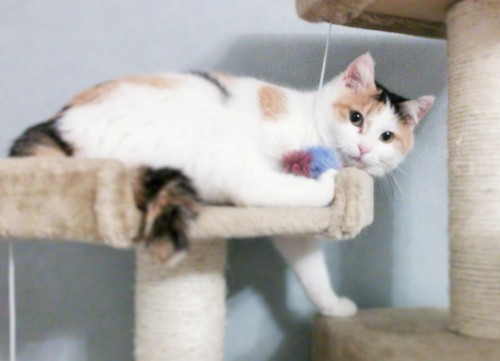 ナナちゃんが突然キャットタワーで遊び始めました。けっこう高いんですよ。ちょっと寛いでみたりして。猫なのに高い所が苦手なのかしら?とすら思っていましたが、そうではなかったことがわかりました。あまりにも動かないと心配でしたが、大丈夫だったみたい。(笑)この表情はフクちゃんに似ています。というか、きっと猫はみんなこういう表情をするのでしょうね。キャットタワーについている鳥のおもちゃで遊んでいるナナちゃん。落ちそうだけど~。(笑)明日でうちにきて一週間。馴れてくれてよかったです。頭の後ろが、漫画サザエさんに出てくるワカメちゃんの刈り上げヘアスタイルみたいです。そこも可愛い・・・完全に猫バカになっております。