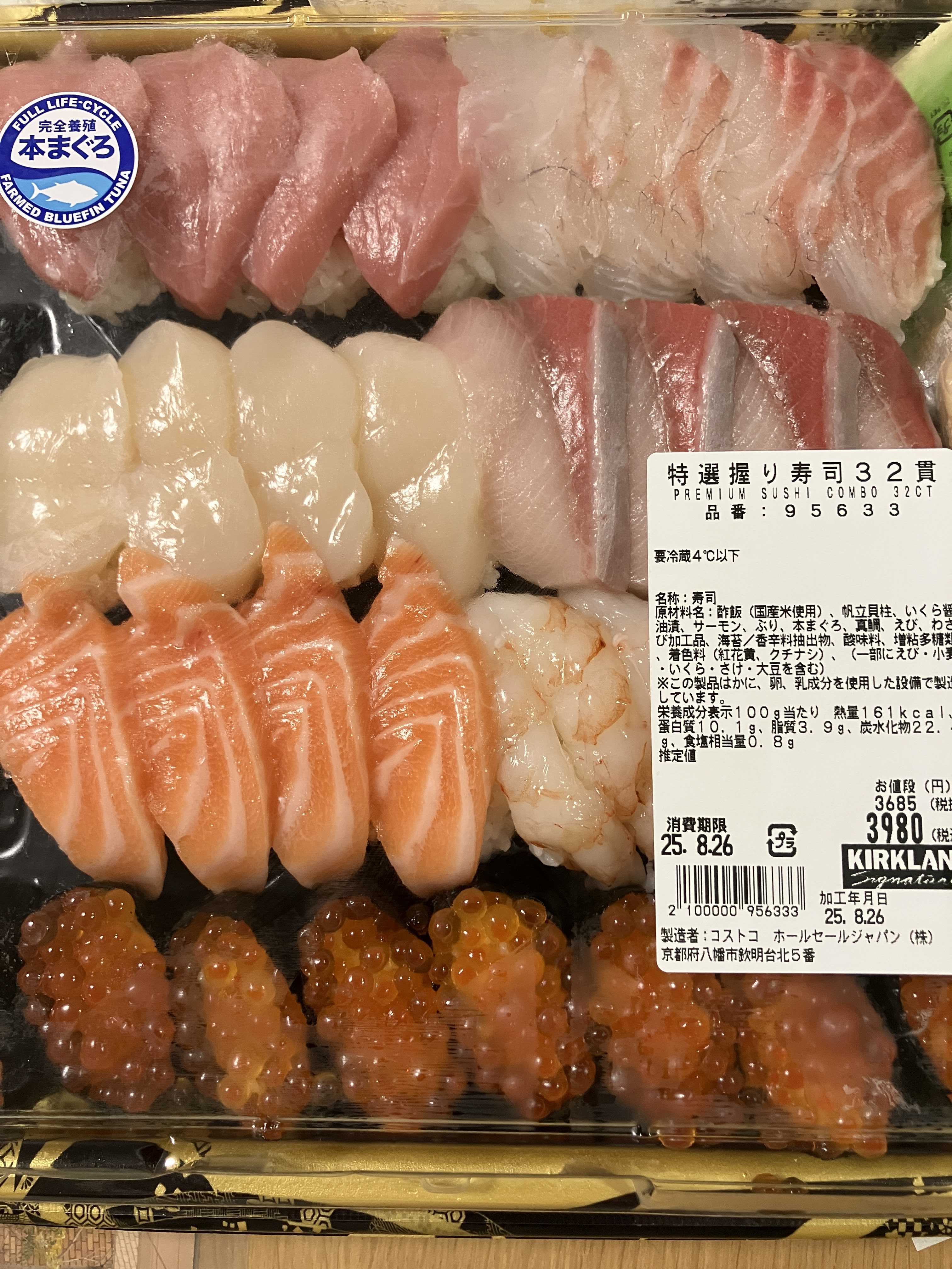 コストコで初めて「特選握り寿司32貫」を購入しました。3980円ネタはサーモン、本マグロ、ブリ、えび、真鯛、いくら、ホタテ貝柱。イクラ多めです。エビはボイルではなく生エビ。 マグロも本マグロです。ちょっとええネタが入っています。イクラが苦手な子供ですが、今回久しぶりに食べてみると「いける!」との事でした。コストコのイクラがおいしいのか、味覚が変わったのか・・・とにかく母は久しぶりのおいしいお寿司が食べられて大満足でした。ラクマで多数出品しています。ラクマメニューメルカリでも多数出品しています。メルカリハイローラー(BLT) 大容量 ベーコン レタス トマト チーズ おかず 惣菜 野菜 美味しい バーベキュー お弁当 食パン 贅沢 人気 コスパ メキシカン レシピ たんぱく質 筋トレ ダイエット ヘルシー サラダラップ ドレッシング 夜ご飯 冷凍 効果 おすすめ【Costco コストコ】価格:3,570円(税込、送料別) (2025/8/28時点)楽天で購入