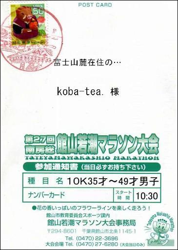 1月28日に南房総の館山若潮マラソン大会に参加します。今日、その参加通知書が届きました。今年のお年玉記念切手が貼られ、記念スタンプが押され………なかなかオシャレな演出だと思いました今日は通院で肺のレントゲンを撮りました。担当医から告げられた一言、『肺にまったく問題ありません!』それはそれは嬉しかったです 今日のトレーニング:ラン 10km 腹筋 200回(50回×4セット)伊東オレンジビーチマラソン(10km)まであと2日↑館山若潮マラソンと書いてしまっていましたが、TAKA38さんに教えて頂き訂正しました。21:52