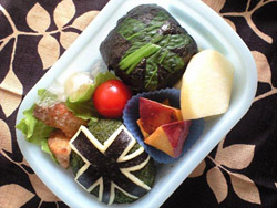 シンケングリーンのほうは、青海苔をこれでもかというぐらいまぶしてあります。ただ、これだとご飯が少ないので、もう一つおにぎりを製作。こちらは小松菜をまいて、その上から「木」の文字を切り抜いた海苔をのせてあります。一応、熊折神を狙ってみたんですけど、面倒くさがってプロセスチーズでの縁取りをサボったら、イマイチな仕上がりに(汗)