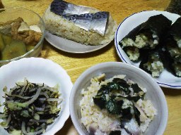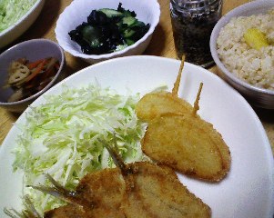 昨日の夜、赤レンガの帰りに寄ったスーパーで、お値打ち品三昧だったので、うはうはで買い物したです。それも魚ばっかり安いのなんのって。半額以下だし、普段なら高いから絶対買えない魚とかばんばん買えたので、今日は魚デー。まずブランチに鯵の干物食べて、明日の朝用にイシモチの煮付け作って、夜はぷちイワシを使ってフライにしてみた~ほぼ1週間ぶりのまともな食事かも(^_^;)イワシフライと、玉ねぎフライと、キンピラと酢の物と、手作りのごま塩と、栗ご飯。イワシはかなり小さかったけど、肉厚でかなりグー!栗ご飯は秋に1回は作りたいので、無事希望達成。めでたしめでたし。今日はお風呂も入ったし、仕事もなさげなのでさっさと寝よう。また明日から頑張るぞ~