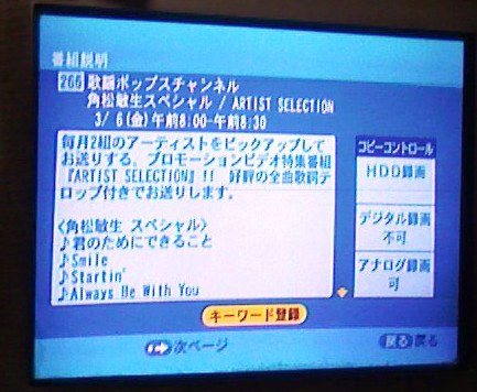 タイトル、ちょっとキャッチコピーに使えそう?…やや古めのタッチか(笑)今日は手元は画面見てパチパチ、でも音がないとつまんないのでスカパで撮りだめしていた音楽系のものをかけて流しておこうと思い、何があるかなぁと見ていると…(kocrisp、ずぼらなのでキーワード登録をして録画をしたまま放置を数ヶ月とかザラです(^_^;))今朝、こんな素敵なプログラムがっほぉ~~~!!!とくダネでは音楽通みたいなオグさんが角松の角の字も言わないのに(毒)スカパでは結構取り上げてるよなぁ…で、早速見たです。すると…誤植を発見!しかもたまたまパッと画面を見た瞬間。見えた?♪手を振るあなたを見てた なんだけど、あたなって…(笑)そんなことでちょと笑いを誘われ、もういっこ見てみる事に。今度は角松がメインではなかったので、撮影は割愛だけど、80年代ニューミュージック~リゾート気分~という番組の中。チューブだのオメトラだのと夏っぽい曲のオンパレードの中で杉さんが2曲も入ってて、稲垣潤一のオーシャンブルーとかもあって(すごい好きだったの。オーシャンブルー)「あ~超懐かしいっ」って思って、それだけで満足だったのに、しばらくすると何だか聞き覚えのあるイントロが流れてきた。これすごくない?このチョイスってスカパならではの感じがする~たいてい夏とかいうと、No End Summerとかじゃん。個人的にはBeach's Widowとかもいいなぁと思うんだけど、Summer Momentsですかっなかなかやるのう。感心感心。季節はずれに聞く夏の歌もなかなかいいものです。それはたぶん、涼しい(てか寒い)中で聞いているからかも。待望のニューアルバム!↓Amazonの割引クーポン、取っておいて良かった~~~(^O^)/■送料無料■通常盤■角松敏生 CD【NO TURNS】09/3/18発売