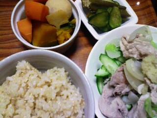 昨日はカラッティーで快適だったけど、今日は何だか日差しのじりじり感がすごかった(~o~)油断していたら、たった数分程度だったのに襟足を日焼けした気がする…首、胸元、顔、襟足、うっすらと色が違うのは気のせいじゃないみたい(T_T)昨夜から世界陸上が始まっちゃって、バレーもあるしで忙しい。貴重な休みだったので、これからに備えて大物を洗って掃除をして、常備食作って、忙しかった。掃除機かけて数分経たないうちに汗だくで休んでばかりだから、ちっとも進まないし(^_^;)今日の晩ご飯はこれから先何日も食べるもの…冷しゃぶもどきと、煮物と、オクラ&胡瓜酢の物…おにぎりもいっぱい作ったので、しばらくの間は朝ごはんは楽々~世界陸上を朝まで見ているわけにもいかないけど、ついつい見ちゃうのよね~