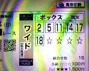 本題の前に…きゃーっレッドディザイア勝った!!ミッキーのガッツポーズ、最高に良いっ\(^o^)/良かったよね!嬉しいよね!おめでとうっずっと負け続けての1冠だもんねっミッキーこと松永幹夫調教師は、現役時代は初回の秋華賞の勝利ジョッキーなんだよ!ファビラスラフィンの勝利、懐かしいよぉ~騎手から調教師になって、自分が手がけた馬でまた秋華賞で勝つなんて何だか運命感じちゃうよねぇ。「牝馬の松永」まだまだ健在!!パドック見ていても、レッドディザイアはすごい良かった。しっかり絞って出てきたし、落ち着いていたし。1000M通過が58秒という、早い展開になったからまあ最後はたるむのかなと思いつつ…レッド、勝てそう!という予感が漂ってくる。位置取りもグー!最後の上がり11.6秒、なかなかです!アンカツがいいポジションにいたので、やだなぁと思いながら見てた~4コーナー手前からの仕掛けはレッドもブエナも良い感じ。でも結局アンカツ斜行で降着。お気の毒~パトロールフィルム見ていると、まああれはしょうがないよね~。アンカツは外へ出したかったんだもんね~あのブエナのもたつきがなかったら、多分レッドは負けてた。ブロードストリートの脚がすさまじかった。あーあ。もっと信じてあげれば良かったなぁ。あ、ちなみにこんな馬券買ってたので(笑)馬券は外れ。当たっていたら、ワイドでもでかかったんだよ~いいの!レッドディザイアが勝てたからっめちゃ嬉しいっ!今日は祝杯だっ心の中で…(笑)あ、それから…四位の勝利ジョッキーインタビュー、低頭で良かった(爆)で、これから徐々に本題。前置き長いね(笑)昨日からのクイックピック馬券販売開始についてだけど…ちなみにクイックピック馬券とは、宝くじでもあるような、コンピュータにまかせて買うランダムピックタイプの馬券。私は使わないから、いいんじゃない?って感じ。個人的には嫌悪感あるにはある。寝る間も惜しんで予想を立てて勝負している人がいる中、ものの数秒で馬券が買えて、それが当たりでもされたらたまったもんじゃない。こっちの方がオッズを動かす影響力が大きかったら非常に腹が立つようにも思う。それはないか(^_^;)けど、そういう票数も自分が投じたのと一緒にカウントされるのもどうもしっくりこない。自分で考えられないなら、そもそも博打すんなと言いたい。「誕生日と同じ番号で買う~♪」とか言ってる無理矢理彼氏に付き合わされて、競馬場でデートするハメになった女の子の方がまだ可愛いし、マシだと思う。一応これも自分の意思は多少なりとも入ってるもんね。ま、私だって行き詰まればラッキーカラーで買おうとか、時事ネタをからめて強引に買う時もあるので人の事は言えないわ(笑)だいたい今日だって、あまりに悩んだら牝馬をエスコート出来るイケメン騎手BOXで買おうとか一瞬思ったし(笑)<川田、幸、福永、三浦、松岡クイックピックについて私のような考えの人はきっと多いはずで、そういう人たちは買わない自由がある。だから、別にいいけど…JRAサイドとしては、自分で物事考える事が出来ない最近の人をうまくターゲットにした商売をしようとしているように見えるからそれは戦略としては良い。マークシートに色々と書き込む手間も省けるし、様々な種類がある馬券の買い方が面倒だと思う人はインスタントで良いのかもしれないし。クイックピックで買った馬券がちょっとでもからんだら、的中した嬉しさはあるだろうし、また買いたくなるだろうし。そういうマーケットを狙っていくのは、商売として成り立つ。もしも、クイックピックを利用する人がすごく増えたとしたら、売れ筋商品になるのだから、地方競馬でも導入するとか、他の公営ギャンブルでも流用するとか、広がりそうなので良い商売になるよね。そういう隙間商売について、最近すごく考えている事が多くてね~いかに隙間を見つけて、誰よりも先に手を打って、先行逃げ切りをするかという事について、ここ数ヶ月考え続けてきた。自分の周りでもそういう商売をしている人はいる。物事を一人で考えられずに流されてしまう人が多い事や、企業が個々のコーチングに手が回らない事、能力の底上げを積極的にしようという人が少ない中で私にも何か出来るんじゃないかって、ずっと考えてきた。一言で「最近の若い子はダメ」と言いきる大人を見ていてめちゃ腹が立つ。それって、私達大人のせいじゃん。そうやって言い切って捨てる事を続けていたらこの先もっと酷いことになる。生まれた時から、あらゆる事に恵まれているのに、それに気付かない。物が溢れかえっている中にいるから、本当に大切なものがわからない。すべて受身でいるから、ほんのちょっとの傷で立ち直れずに鬱だの引きこもりだの…与え続けたのは誰?匿ってきたのは誰?そんな事もわからなくなっちゃってる世の中。この辺、自分の頭の中でジレンマが生じていてさ。隙間を見つけて、そこを突いた事するのって気が引ける