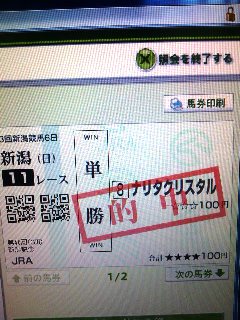 きゃーっ!新潟記念、幸くん@ナリタクリスタル(逆だってば(笑))が勝った!!!!ヽ(^o^)丿サマーシリーズチャンピオンおめでとうっ大どんでん返しじゃん。くーっ、さすが幸くん!ちょとね、ここ数日心情穏やかでない事が続いてまして(全部仕事)今朝なんてもう外の暑さに負けない位頭がシューシューしていたので、開き直って競馬してた(笑)で、新潟記念にナリタクリスタルが出るということでパドックからがっつり凝視!ヒロシがパドック見てナリタの事を軽い扱いをしていたので、これはいけると判断して(爆)単・複を購入。今年の新潟記念は難しかったけど、スマートギアだけは絶対いらないぞと思いながら、連複で買うには難易度高いしでおとなしく単・複だけにしておいた。で、レースはもうひたすら「幸、頼む!(もう呼び捨て)」と祈るだけ。新潟の長い直線の叩き合いは相変わらず凄いやね一旦は外から差されるかと思ったのに、粘ったナリタ、幸くんも渾身の鞭。で、勝った後によぎったのは「あ~~民放で久々幸くんのインタビューが流れるっ♪録画録画…」と、慌てて録画セットしたのに…勝利ジョッキーインタビューなしかよっ(ーー;)楽しみにして正座(気持ちだけ)して待ってたのにぃTVKに期待しよ。200円が1270円。まあまあでないかい? てなわけでご機嫌が直ってきた(多少(^_^;))ので、頑張って仕事してきます(^_^;)
