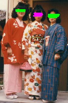 今日はリンクスさんのpiro3119さん(ぴろっぴさん)のところでお話しに出たきものの話しをしましょう~成人式で、きものを着た若者を目にされてると思います。男の子もね~羽織袴でカッコいいじゃないの~…あれってニュースでは成人式でお揃いの着物で暴れてる若者の姿がおいおい…何のために着てるんだか…嘆かわしい。。きものって言うのはそんな風に着ちゃイカンという話しから、着付け教室を開いてる母の事を書いたら「足長さんも小さい時から着物を良く着ていたのでしょうか?」とのご質問を戴いたので、自分を振り返ってみました。母が着付けを教えてるというと、私も自分で着る事が出来るように思われますが、…できません。。浴衣くらいしか姉は母の勧めで教える資格も取ってますが、私はテンデ興味無しで今の今まで…嘆くは実家の母です。。そうそうぴろっぴさんのご質問ですが、記憶を辿ると小さい頃と言えば七五三くらいしか着てなかったんじゃないかな。手元に小さい頃の写真がないので…でもね、相当昔のも出てきたんですよ~!顔は隠します~!姉・私・叔母これは15歳位かな~お正月みたい。それから大学の卒業式で袴をなつかしぃ~成人式にきものを着て行くのが嫌で、式には出ずに友達と遊びに出かけてしまった事も。母はガッカリしてました。そりゃそうだ~メインの行事なのにね親不孝者です…すみましぇ~ン。。それからこれは…あっ!思い出した♪これ着て夜遊びきもので夜遊び?えー!えー!これで飲みに行ったのよ~母も一緒です。。もちろんこれらは全部母に着せてもらいました。長女が生まれた時の母の第一声…「娘に着付けを教えるのは無理だったけど、孫に教える事ができる」って。長女の三歳のひなまつりさすが女の子きもの着てニコニコ!そして7歳のお祝いとりあえず私も着せてもらった☆きものは後ろの帯結びを見せないと…母に怒られちゃうから。背中の花紋が母のコダワリ?普段着てないのに、こんな時に着てもワリとシックリきてませんか自画自賛え?おばさまも七五三か着てるというより、着られてるって言う感じ ほよよ。。日本のステキな伝統だと思うようになった今日この頃。ばあさまになったら、娘から着付けを習うかもしれない…私