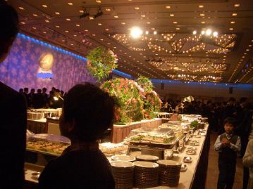 8日はすごい雨風で、子供達の学校送迎を車でしました。普段なら、そこまではしないけど、夕方からは大事な、そう我が家にとっては大事な用事があるので、雨に打たれて熱でも出されないように、万全の態勢で臨む午前中は電車も遅れが出てたみたいだけど、午後は通常運転に復帰駅までタクシーでGO ホームで電車を待つ身の辛さ。。超~風が冷たい。何とか有楽町に到着駅でオヤジと合流 オヤジ「こんなスゴイ日に子連れで、都内までよく来たな偉いぞ母さん」はいはい何てったってホテルでのご馳走と、豪華景品につられてねParty会場は帝国ホテルの孔雀の間…どんな所?こんなでした そして乾杯の音頭をとったのは、プロゴルファーの青木功さん乾杯が終わったら…一斉に食べる目の前で握ってもらうお寿司の旨い事長男はお皿にローストビーフを4切れも(大人は一切れずつだったよね)揚げたての天ぷらに、作りたての中華…その他諸々…お腹は直ぐにイッパイその間にも、カンパリソーダ、赤ワインをグビッグビッ司会「今夜のスペシャルなゲストを紹介しましょう」誰誰が来てるのオヤジも聞いてないみたい。司会「 T I M のお二人です~」長男の目がキラリンステージ前にダッシュ将来の夢はお笑い芸人になること そんな長男がはじめて生で観るお笑い芸人TIMから「ポケモンSunday」のシールを貰ってご満悦画像がない…TIMは撮影禁止でした。TIMが盛り上げる中、BINGO大会が始まった。ご存知の通りビンゴカードは5×5マス真ん中のマスを一つ開けてスタート…すると、5回目の数字のコールでなんとBINGOが一人出てしまいました。ガックシ。。一等 40型液晶テレビ 欲しかった。。1年の研修を終えて4月に配属になったばかりの若い社員の男の子ワンルームの狭いお部屋で…40型。。目を悪くするよ…欲しかったiPodや豪華宿泊券、お食事券、ノートパソコンなどが当たってく。。足長家は全然ダメ司会「逆BINGOを始めます。今から呼ばれた数字が無い人が残っていくルールです。」これに長女が最後の7人に残った景品はデジタル一眼カメラキャノンじゃないけど、欲しい頑張るのよ~うぃたん司会「10番」…残念。。。結局、BINGOは惨敗涙をのむ。。なので、山のようなスウィーツに手を出すホテルのデザートは美味いたらふく戴いてチョッと一休み。オヤジの同僚の方々と談笑写真を撮ろうとすると、会社の方が一緒に右側の…おじさま。。く、くっつきすぎでないの後でオヤジに聞いたら、専務取締役だそうです。。ひぇ~~~な、なにか失礼な事言っちゃわなかったかしらわたし。。酔っ払ってるからゴメンアゾヴァセッ専務も酔っ払ってたから大丈夫だよねお土産はお花とケーキを戴いてきました。 紅白饅頭ならぬ紅白ロールケーキこれも超~美味かった今年はロールケーキづいてますな~ダイエットは…このケーキを食べつくしてから始めることにします