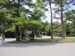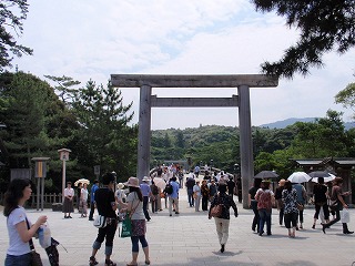 外宮にある神社は全て神社の横またはその近くに空き地(新御敷地しんみしきち)があった。遷宮するための土地なんですね。内宮も月読宮(つきよみのみや)もそうでした。外宮をでたところにバス停があり、内宮へは10分おきにバスが出ていました。外宮に行ったときは9時30分ごろで人が少なかったけど、内宮はほんとに人が多かった。内宮の入り口宇治橋を渡るとそこは内宮一番奥の御正宮(ごしょうぐう)が天照大神(あまてらすおおみかみ)をおまつりする皇大神宮(こうたいじんぐう)となります。そこにいたる砂利道はごみひとつ、葉っぱひとつ落ちていません。そこを歩いているとすぐ目の前に小枝が落ちてきました。葉っぱでなく枝なんです。それを見て上を見上げたとき木漏れ日の太陽が目に入ってきました。そのとき、木の枝は「御正宮の建物を拝むんではないよ。太陽神である天照大神はここにいるよ。」という暗示だと判りました。そこで太陽様に挨拶をしてから、御正宮に向かいました。御正宮は石段の下からしか撮影できません。正面に目隠しの薄い布が垂れており直接見えないようになっています。もっともその建物横に行くと柵があり丸見えなんですが。そこで2拝2拍手1拝して、「一人でも多くの方がアセンションできますように。。。」などお祈りをしていたら、風が吹いてきて薄い布が持ち上がり、正面から見えました。もっとも御正宮は塀に囲まれていて屋根の上しかみえません。それで横に回って撮ったのがこれです。あとの神社はささっとみて、帰ろうとしたとき、アセンション関係のお祈りしかしてないことに気づき、せっかくここまできたのだからともう一度御正宮間で戻り、家族のこと、親戚のこと、会社の社員のことなどなどいっぱい(欲張りなんです)お祈りしました。内宮を出たら参道が見えて土産物屋がいっぱい目に入ってきたのですが、そそくさと次の月讀宮に向かった。実は今日のお伊勢さんめぐりは月讀宮に引かれて来たんだ。<つづきはまた明日>