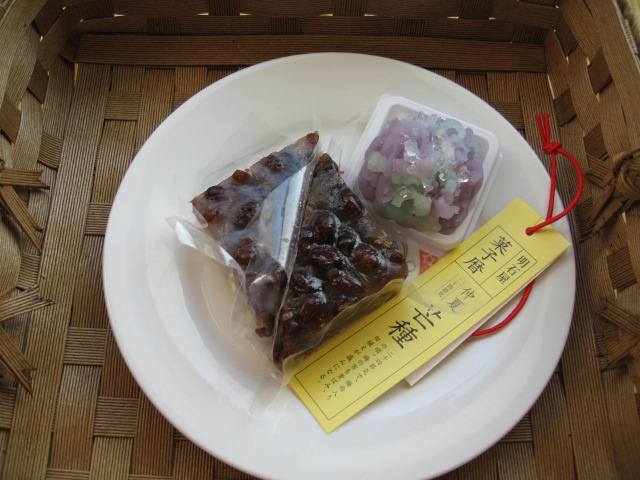 今日お友達が明石屋の和菓子をお土産に遊びにきました。 左が、明石屋の今月の朝生菓子の「水無月」です。爽やかな甘さの三角ういろう生地に、ふっくらやわらかい備中大納言小豆を載せて涼しげな氷に見立てました。迎えくる暑い夏を健やかに過ごせるよう、この水無月を食べて祈る習慣が、古く京都に伝わる。涼を呼ぶ朝生菓子です。と、説明されています。ういろうの部分が、プレーンと黒糖の2種類になっています。右は、この時期定番の、「あじさい」です。雨上がりにきらめく紫陽花の風情。紫と水色のきんとん仕立てに錦玉を小さく散らしました。中餡は丹波大納言つぶ餡です。と説明されています。和菓子って季節感があるので大好きです。以前、お茶を習っていたときも、お茶菓子が一番の楽しみでした。ガラスの器などあれば、もっと涼しげに見えるのでしょうね。食器もそろそろ買い換えなくてはと思ってしまいました。