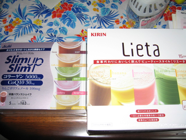 ダイエットはじめて1週間がたちました。ちょっとですが2キロやせました。最初の5日間は、上のアサヒのスリムアップスリムを飲みました。下のキリンに比べると甘みがないかな?味的にはキリンがおいしいです。今飲んでいるのは、下のキリンのリエータです。こちらはおいしいです。そのほかに、DHCのサプリメントも飲んでいます。朝は、このダイエットシェイクを飲んで、お昼はお弁当です。今までよりご飯を半分にしました。夜もご飯は半分で、なるべく野菜をたくさん食べるようにしています。それから、間食をやめました。それから、水分を多く取るようにしています。これからは、運動を少ししていかないと、リバウンドしてしまうらしいので、がんばってウォーキングを始めようと思っていますが、先日から鹿児島も急に寒くなり、外に出たくないです。。。。あと、マッサージに行っているのですが、そこでは整体もやっているので、体のゆがみも直そうかなと思っています。ゆがみがあるとやせにくいということなので、こうなったら、何でもかんでもって感じです。とりあえず、減ったので、維持していきたいと思います。年末まであと2~3キロ減ってくれれば、バンバンザイです。