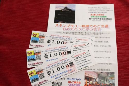 郵便受に「はしご酒大会当選結果のお知らせ」と印刷された封筒が入れてありました。封を切ると「スタンプラリー抽選でのご当選おめでとうございます」と書かれたものと「はしご酒大会」に協賛された店舗で使うことができる「金券」が入っていました。「熊本はしご酒大会」は毎年開かれていて昨年も参加しました。参加費は前売りチケットで2,500円で指定された(受付で渡される用紙に店舗名が記載)3店舗を回るというもの。各店舗でスタンプを押してもらい、その用紙を指定されたコンビニに置かれたBOXに投函、その抽選に目出度く当選したのです。 金券は3千円分と僅かですが、どうせ当たらないだろうと思わず投函したのがよかったようです。