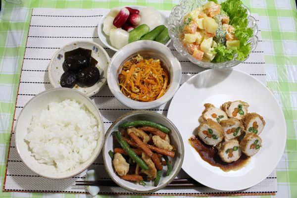 今夜作ったのは「鶏ムネ肉の熊本長人参といんげん巻き」と同じ食材を醤油、味醂、酒少々、砂糖少々で味をつけたもの。ほかに並んだのは常備菜と今朝の残り物。 人参は肥後野菜の一つ熊本長にんじん。熊本長にんじんは江戸時代初期に渡来したとされる東洋系のニンジンで、古くから熊本で作り続けられてきた伝統野菜。昨年末、おせちに使おうと買っていました。おせちに使うのを忘れて2週間以上経ってやっと食卓に登場。熊本長にんじんがスーパーの店頭に並ぶのは正月用の縁起物として年末だけのようです。 夕方まで熊本市内の行きつけの角打ち店へ挨拶に行き早々と帰宅したので作ろうと思った二品、もう少し飲めば作りたくなくなるところでした。