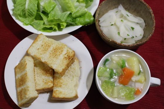 今朝も仕事へ出て行く二男に何を食べさせようかと考えました。冷蔵庫には大したものはなく思い付いたのがこちら。 玉葱、人参、ジャガイモ、大根、カリフラワー、ロメインレタスのクリームシチュー。 そして大根の朝漬け。この朝漬けにはセロリの葉の微塵切りを入れてみたところとてもいい香りに仕上がりました。 ロメインレタスの盛り合わせは深煎り胡麻ドレッシングで頂きました。