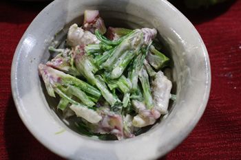 昨日、熊本市内の繁華街の野菜ショップに「あーさい」という初めてお目にかかる珍しい野菜が売られていたので是非食べてみたいという衝動にかられて購入。 私は天丼屋さんで美味しい天丼を食べましたが帰宅して息子のためにアーサイを使って作ったのはグラタン。 グラタンのほかは白菜と小イワシの煮物、スゥィートスプリング、トマト、キュウリの朝漬けでした。 このアーサイのグラタンは息子用のため私は一口も食べていません。まだ寝ている息子が起きてきたらアーサイをどのように感じたのか訊こうと思っています。 アーサイ、この彩りと形は弁当の一品としても使えるなと思い、また是非栽培してみようと思いました。