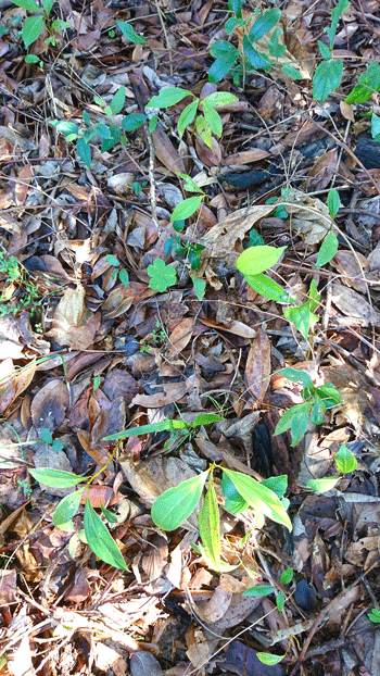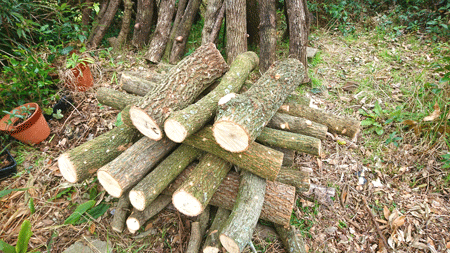今日は、昨日、山鹿市の友人のご親戚宅のクヌギ林から頂いてきた椎茸の原木を車に載せて実家へ帰省しました。 椎茸原木は肉桂の樹と樫木の間に交互に重ねました。 重ね置いた原木に先日剪定したイスノキの枝葉を被せて終了 数ヶ月経過したあと立てる予定です。奥の椎茸原木が朽ち果てる頃、この原木から収穫できるだろうと思っています。