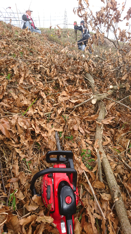 今日は山鹿市在住の友人のご親戚の方が所有されるクヌギを頂きに山鹿市へ向けて出発。9時に国道3号線沿いにある農産物直売所「夢大地」で待ち合わせ。 クヌギ林まで数分で到着。今回は山鹿市の友人ご夫妻と友人の奥様のお姉さん、親戚の方、そして熊本市内から私を含めて3人の総勢7名での作業でした。 クヌギの立ち木は昨年の11月に伐採されたのことですが1mちょっとくらいの長さに切断する作業が待っていました。 急な斜面に切り倒されていたクヌギはチェンソー2台で頑張った結果12時過ぎには切断を終えて道路へ全て下ろし終えました。 お昼はコンテナに新聞紙を敷いた上にこんなご馳走が並びました。外で食べる手作りの料理の数々は格別でした。 椎茸とコンニャクとタケノコの煮物。 味噌汁まで頂き大満足でした。 お昼を済ませて椎茸菌が付いた駒打ち作業。 今回、私はチェンソーでの切断作業とクヌギへの駒打ち前のドリルでの穴あけ作業担当でした。 切断場所が急斜面だったこともあり少々疲れましたが駒を打った原木を15本も頂いてきました。原木椎茸は1年半後、2021年の秋に収穫できる予定です。