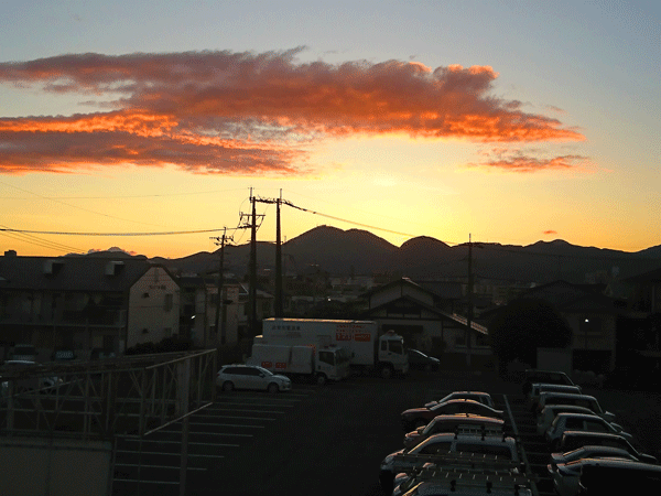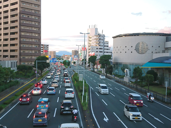 東バイパスにかかる歩道橋上からの風景。郊外へ帰宅を急ぐ車で混んでいました。