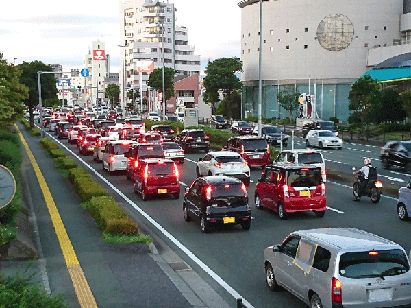 歩道橋を下りて撮影。車4台のナンバープレートは塗りつぶしています。この渋滞は約300 m