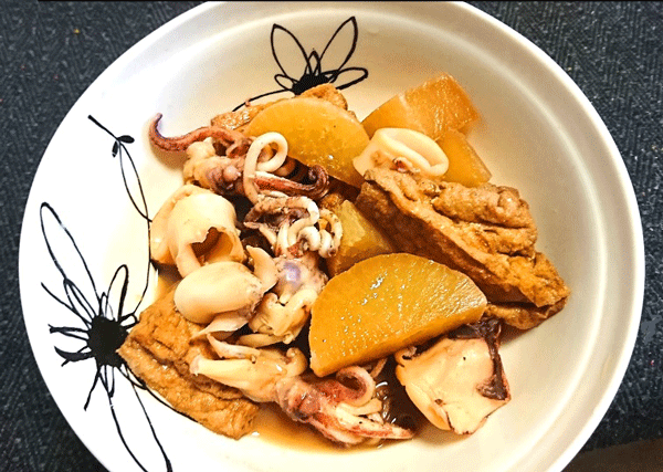 今夜のもう一品は、イカと大根と厚アゲの煮物。イカをいかに柔らかく