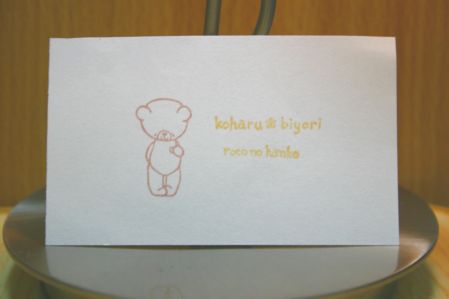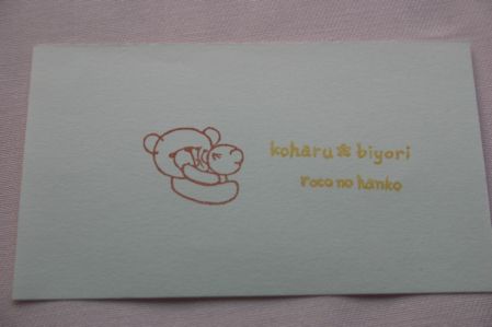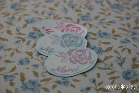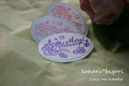 先日ご紹介したシール用はんこ。 (前回のシール用はんこはこちらからどーぞ^^⇒ ☆)多色にしてしまったのは失敗だったと今回は単色で作れるはんこを彫ってみました。ちょっと地味だったのでエンボス加工を施してみました。分かりますでしょうか??シールにエンボスって大丈夫なのか??と不安でしたが全く問題なしvちゃんと貼ってはがせるシールができました(^^)♪ただねぇ・・・(^^;文字って難しいですねぇ(;--)かなり苦労したわりにへなちょこでガッカリです・・・。手書きの文字ならばなんとかいけるかと思ったんですけどねぇ(笑)バラのイラストは実際には花全体が描かれているはんこなのでシール以外にも使おうと思えば使えます。文字が湾曲しているのでかなり無理矢理になりますが(^^;シール用というかメッセージはんこ的に使おうかと・・・。ちなみに“Bonjour”バージョンもありました。何故画像がないのかって・・・??綴り間違ってしまったので・・・。“Bonjor”になっちゃった(爆)デザイン的にはこちらの方がお気に入り♪“u”さえ抜けていなければ・・・(T_T)バラとメッセージがちょっと離れているので2色押しも可能ですvう~ん・・・何度見ても地味なメッセージはんこ。雰囲気が私の柄じゃない気がするけど結構使い道がありそうな無さそうな・・・。