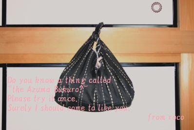 学研さんで出している商品にこんなものがあります。その名も“あずま袋”。職場の近所の文房具屋さんで見かけて以来ずっと気になっていた商品です。で、買っちゃいました♪これがねぇ~、結構便利なんですよ。ペロンペロンなのでどんな形の物にもフレキシブルに対応してくれるし風呂敷みたいにただの布じゃなくてちゃんと袋状なっているので結び目を解いても、中身がこぼれる心配が少ない。生地がしっかりしているので案外重たくても結構いけちゃう!しかも、2,000円出してお釣りがくるというリーズナブルさ!!う~ん・・・おぬし、なかなかやるではないか^^*こいつはもっぱら私のお弁当とはんこセットを持ち歩くのに活用されていますが、職場で頂き物をすることが多いrocoにはありがたい便利グッズの一つです。ただね、一つ気になることが・・・。これ、見ると簡単に作れそうなんですよね。ちょうど良い布があれば作れるんじゃ・・・。と、思っていたところ、やっぱりありました!!書店で「あずま袋の作り方」の載っている本が・・・( ̄□ ̄;こっち買えば良かった・・・??あ~・・・本のタイトル控えるの忘れたぁ~!!(>_<)しかもね、あずま袋って昔からある物なんですね。知らなかった~・・・。やはり昔の人の作る物というものは利に適っています。無駄が無いのがすごい。みなさんも、ちょっとしたお買い物の際ご利用されてみてはいかがですか?身近で出来るECOですね。ちょっと高価ですが、こんなのもステキですよネ♪絞り染めがオシャレです。絞り染めのあずま袋【墨黒/ブラック】こちらのショップです → くるり pocheリーズナブルでこちらもお勧め。和柄がかわいいです。*さくら・SAKURA!*☆桜ブーケ☆ あずま袋この商品はこちらから → インテリア&和雑貨 京都 夢み屋
