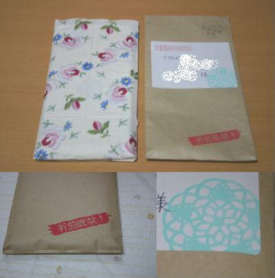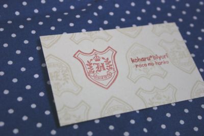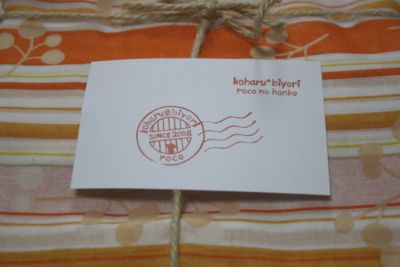 先日、我が家の郵便受けに一通の封書が届きました。ウヒヒ・・・♪丁寧な字で宛名書きしていただいてます。みなさまも私の楽しい思い出を共有して下さい♪「折曲厳禁」や郵便番号枠も手彫りはんこですよ!!ドイリー風はんこもぶれがない・・・。なんて正確な線なんでしょう。すげ~・・・。封を開けると、中からレトロな柄のペーパーナプキンが出てきました。おぉ・・・。ペーパーナプキンの中からは「ほっと*たいむ」の☆ravi☆さんのお手製ポストカードに名刺サイズのカードそして和柄のはんこが押してある布巾にかわいいシールまで!ムッハーっっっ( ̄▽ ̄)=3実は私、☆ravi☆さんの50,000hitカウントプレゼントに(50,000hitですよ!すごくない??すごいよなぁ~・・・)応募しておりました。エヘ♪クイズに答えたのですが、結果は × でした(T_T)ですが、心優しい☆ravi☆さん。クイズに外れても、参加賞としてお手製グッズをプレゼントしてくださったのでした。☆ravi☆さんのはんこは正確に彫られているのがとても印象的です。とても丁寧に正確に・・・。私にはない要素です。線の太さも均一でキレイなはんこです。特に布巾に押してあるドイリーのような和柄のはんこなんて、本当にキレイで「手彫りですよね~!??」ってカンジなんですよ!押し方もとても丁寧だし。色のチョイスも雰囲気出てます。勿体無くて使えない・・・。☆ravi☆さん、素敵なプレゼントありがとうございました^^*今回初めてケシハニスト様の作品を直に見ることが出来、良い刺激になりました。私もこんなふうに素敵なはんこが彫れるようこれからも精進してまいりますよ!!はぁ~・・・いつかカウプレしたいと、ちょっとだけ憧れたrocoなのです。