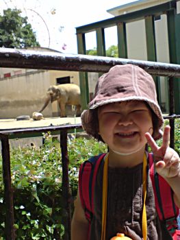3連休もあっという間に終わってしまいました。みなさんはいかがお過ごしでしたでしょうか?rocoは久しぶりに遠出をしました。行き先は王子動物園。兵庫県にあります。rocoの家からだと電車で1時間ほどのところなのですが、なんと、各駅停車で行けば乗り換えが要りません。なので小さい子を連れて行くにはもってこいなのです。はるちゃんは比較的電車での移動がスムーズ。あまり車内で騒いだり、動き回って困るといったことがないので、今回は電車でちょっと遠くまで行ってみることにしました。それでも行きは心配だったので各駅停車から快速に乗り換え、快速から別の電車へさらに各駅停車へと乗り換えを繰り返し、気分を変えながらの移動に。乗り換えと言っても本当に電車に乗ったり降りたりの繰り返しでホームの移動があったりするわけではないので楽チンです。疲れてしまうかな・・・?と心配もあったのですが目新しい電車に興味津々のはるちゃんは疲れ知らずでした。おかげで目的地まで難なく到着。灘駅というところで下車しました。車では一度来たことがあったのですが、電車は初めて。しかも今回ははるちゃんとrocoの二人旅です。迷子にならずに行けるか・・・。という心配は全然必要なく、駅からの道をまっすぐ進んだ先にすぐ見えてきました。はるちゃんは久しぶりの動物園にドキドキ☆「ゾウさんは?ゾウさんどこ??」とソワソワ・・・。到着して早速ゾウさんに会いに行きました。念願のゾウさんに会えてご機嫌です。ホラ、このとおり。ゾウさんの前で満面の笑みです(笑)しかもこの日、ゾウの赤ちゃん(去年誕生したそうです。)に会うことが出来ました。赤ちゃんのオウジくんは1歳になったそうでまだお父さんとお母さんと同じ運動場には出ることが出来ません。一日の間にほんの少しだけ外に出て遊ぶようです。太い格子に囲まれた運動場だったので見にくかったのですが貴重な体験でした。子供のゾウって、体毛が濃いんですよ。みなさんご存知でしたか?ぽやぽやの毛が頭や背中に生えているんです。はるちゃんも子ゾウのオウジくんに夢中でした。ですから、お昼ご飯はゾウさんが見えるベンチでいただきました。ライオンも見ましたよ。ヒョウをこんなに近くで見ることができました。その後は夜行性動物のコーナーで同じくらいの年の男の子と仲良くなり一緒に園内を回らせてもらいました。結構仲良しです(笑)男の子のお母さんもとても優しい方ではるちゃんの相手をしてくださって私とても助かってしまいました(^^*暑さのせいでほとんどの動物はやる気がなく日陰に寝そべっていましたがはるちゃんは楽しかったようで目一杯遊んで帰ってきました。帰りは勿論各駅停車で。おかげで乗ってからしばらくするとはるちゃんは眠ってしまいました。そのまま電車に揺られること1時間。ちょうど良いお昼寝です。車で出かけると親も子も楽なのですがガソリン代がかかるし・・・。たまには苦労もさせないとね☆おかげで印象深い遠足になったようですよ^^小さな子がいたって電車でお出かけ出来るんだ!!と少し自信がついたrocoなのでしたv