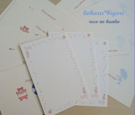 どもども。昨日は久しぶりにはるちゃんとお買い物に出かけました。そして、これまた久しぶりに大量に買い込みました。しんさんのワイシャツだけで長袖、半袖合わせて5枚。ネクタイと下着も何着か購入。主な目的はしんさんのワイシャツだったんですが、他にもはるちゃんの服と私の夏用の部屋着を購入。おかげで大荷物で電車に乗る羽目に・・・。お買い物をする時は意思が固くなくてはいけません。財布の紐も緩みっぱなしの一日でした。今月をいかに乗り切れば良いのやら・・・(--;そんなわけで今日は一日中疲れて寝まくってたrocoとはるちゃんです。昨日ご紹介しました☆ravi☆さんからのお届け物の中で触発されまくってしまったものがありました。その結果、こちらが出来上がりました。☆ravi☆さんのようにはいかなくて線がかなり歪んでしまいましたが便利。こんな感じでポストカードを作ってみました。こんなふざけた郵便番号枠でも郵便屋さんはちゃんと気づいてくれるでしょうか・・・??それだけが不安です(^^;こういうはんこはあると非常に便利です。ノーマルタイプも作っておこう♪あと速達とか注意書きのはんこなんかも便利かも。配達記録や書留のはんこは・・・要らないね・・・(笑)人様の影響をモロに受けやすいrocoなのです。はぁ~・・・今日も暑い一日でした。梅雨はどこへ行ってしまったのでしょう??もう明けたのかしら?これからrocoはお夕飯の支度です。今日の献立が全く浮かびませんが、頑張ります・・・(T_T)