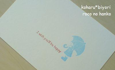 本日2度目の更新です、こんばんは(^^)早速ですが…。う~ん…今日の画像はいつにも増していまいち度が高こうございます(^^;このはんこに見覚えのある方相当なrocoはん好きとみえます(笑)見覚えのない方正解はこちら ⇒ ☆私ははんこを彫るとき全て白抜きにするかベタを残すかでとても悩みます。その彫りあがりの表情が全く違うからです。線だけを残して彫るとそれだけでも使えるし後で色を添えることもできますよね。だから使い道も増えるし見栄えも良い。でも、はんこの基本はやっぱり単色。多色はどうしても「版画」のイメージです。だから気に入った図案は両方彫ってみることが多いのです。このはんこも、そんな「迷った」はんこの一つ。珍しく、「両方気に入った」はんこでもあります。このはんこは春先に彫ったものですが今の時期にしっくりくるように思います。そんなわけで今回皆様にお目見えしたのですが、珍しく名刺ではなくポストカードに仕立ててみました。白抜きとベタのコラボ(笑)手持ちの色で良い組み合わせが見つかりませんでした・・・(^^;本当はこのはんこは淡い色で押すのが好きなんですけど、淡い色は画像では分かりにくいんですよねぇ~(×_×;毎日なかなかお天気がすっきりしないですよね。今日は晴れてたし。今年の梅雨は気温はそんなに上らないので助かっていますが、雨の量が少ないような気が…。曇って少し降って・・・の繰り返し。青空が見られる日も少なくありません。雨が降らない梅雨というのも変ですよね。私としては朝の雨は保育所へ行くのが大変なので困るのですがそれ以外の時間帯は降ってくれても嫌じゃないかなというカンジです。しとしと降る雨はちょっと好きです。静かで、温かくて、ただ雨の音だけが聞こえるそんな静かな雨の日は家でじっくり手仕事をしたいものです。現実は職場のデスクで書類の山に埋もれているのですが・・・。はるちゃんは、雨が降ると長靴がはけるのでとても喜んでいます。今着ているカッパは去年購入したもの。購入当初は「自転車に乗せるから(←っていう理由も良く分からないけど・・・^^;)」と大きめサイズを用意しました。がっつり使いこんで今はちょうど良いサイズになってきました。でもあちこちに引っ掛けた痕が・・・(^^;そろそろ新しいかっぱと傘を買ってあげたいな・・・と思うrocoなのです。