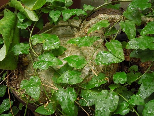 もう1鉢のトリパルチタスとプベッセンスは蔓も葉も旺盛に伸ばしているのでもうしばらく雨ざらしです。