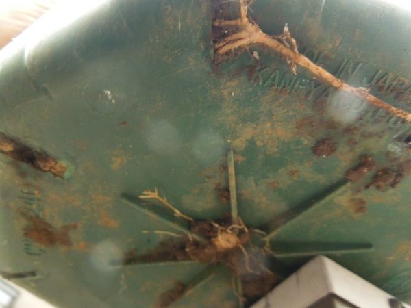 鉢の底を見ると、根が伸びて鉢底から出ていました。生きてはいるみたいです。3月末に暖かいハウスから来た時に鉢が窮屈そうで植え替えをしてそのまま外に出したのですが、まだ寝ぼけているのか・・・このまま雨ざらしにするのはマズいと思うので雨の当たらない軒下に取り込みます。