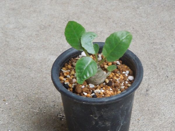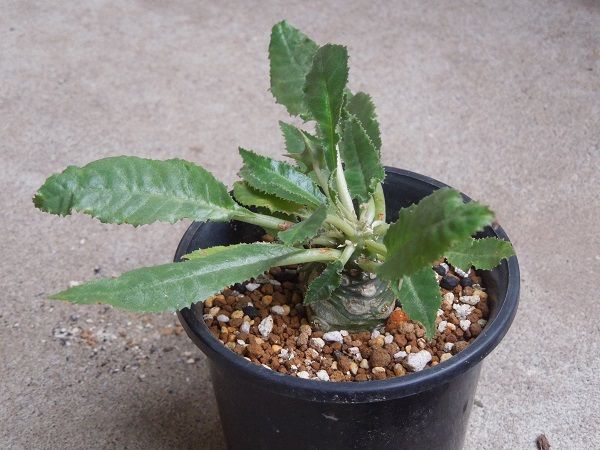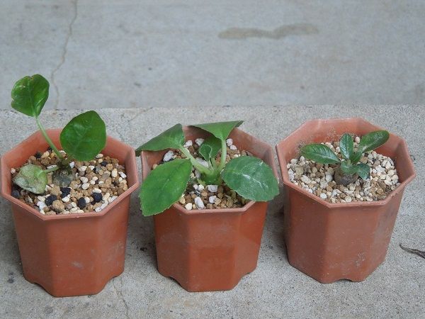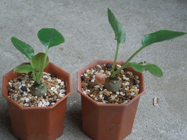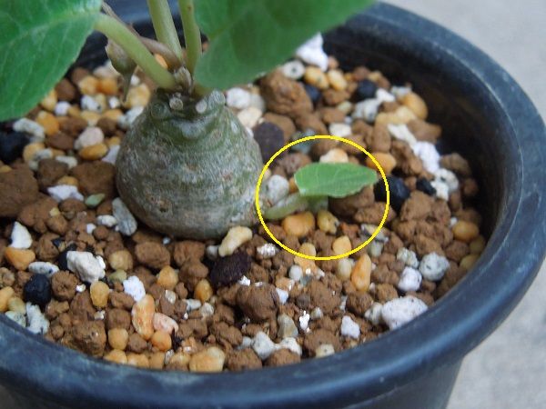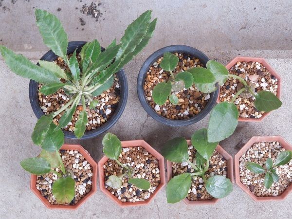 種を採って蒔いても全然発芽しないドルステニアフォエチダだが、あちこちに種を飛ばして勝手に育っているのを鉢上げした。全部で7鉢、1本だけ葉の形が違うのが有った。1本だけ有るクリスパが混ざったか???クリスパとして入手したものはもっと葉が細長い。