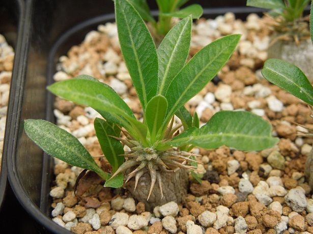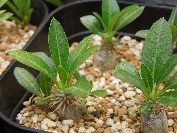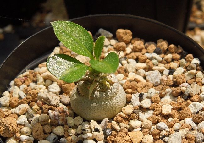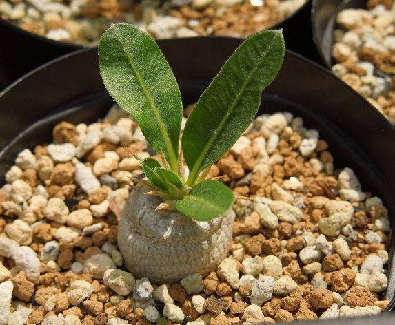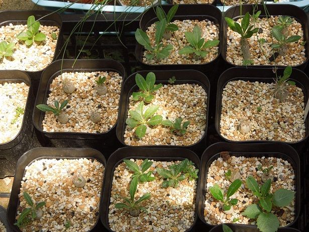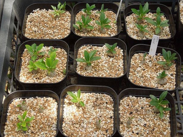 昨年実生して今年5月に植え替えをしたパキポディウムの実生苗、梅雨でいくつも腐らせてしまったが(まとめて植えてある鉢はどれも4本づつ植えてあった)、残っている苗は夏の日差しを浴びて調子良さそうだ。