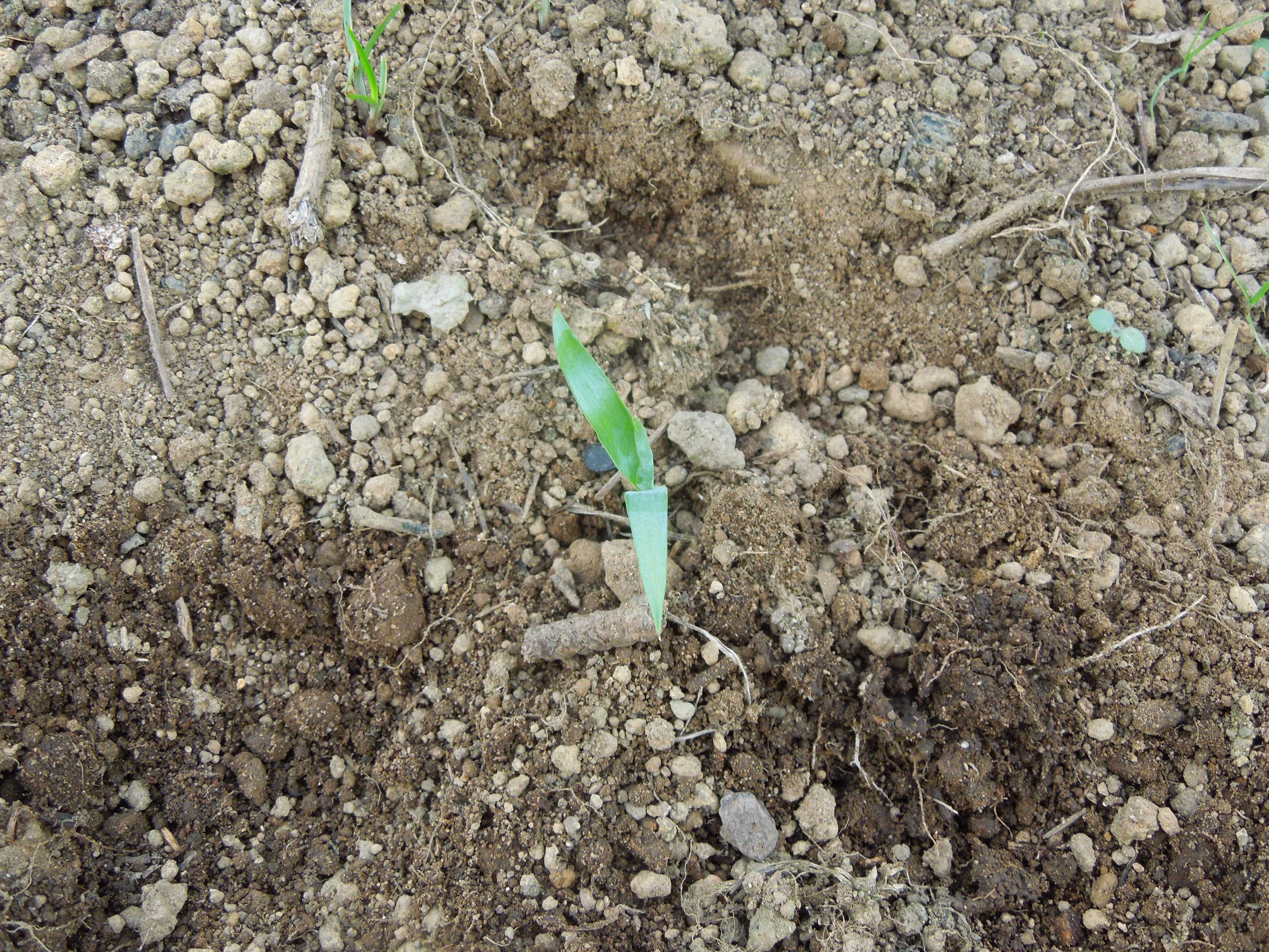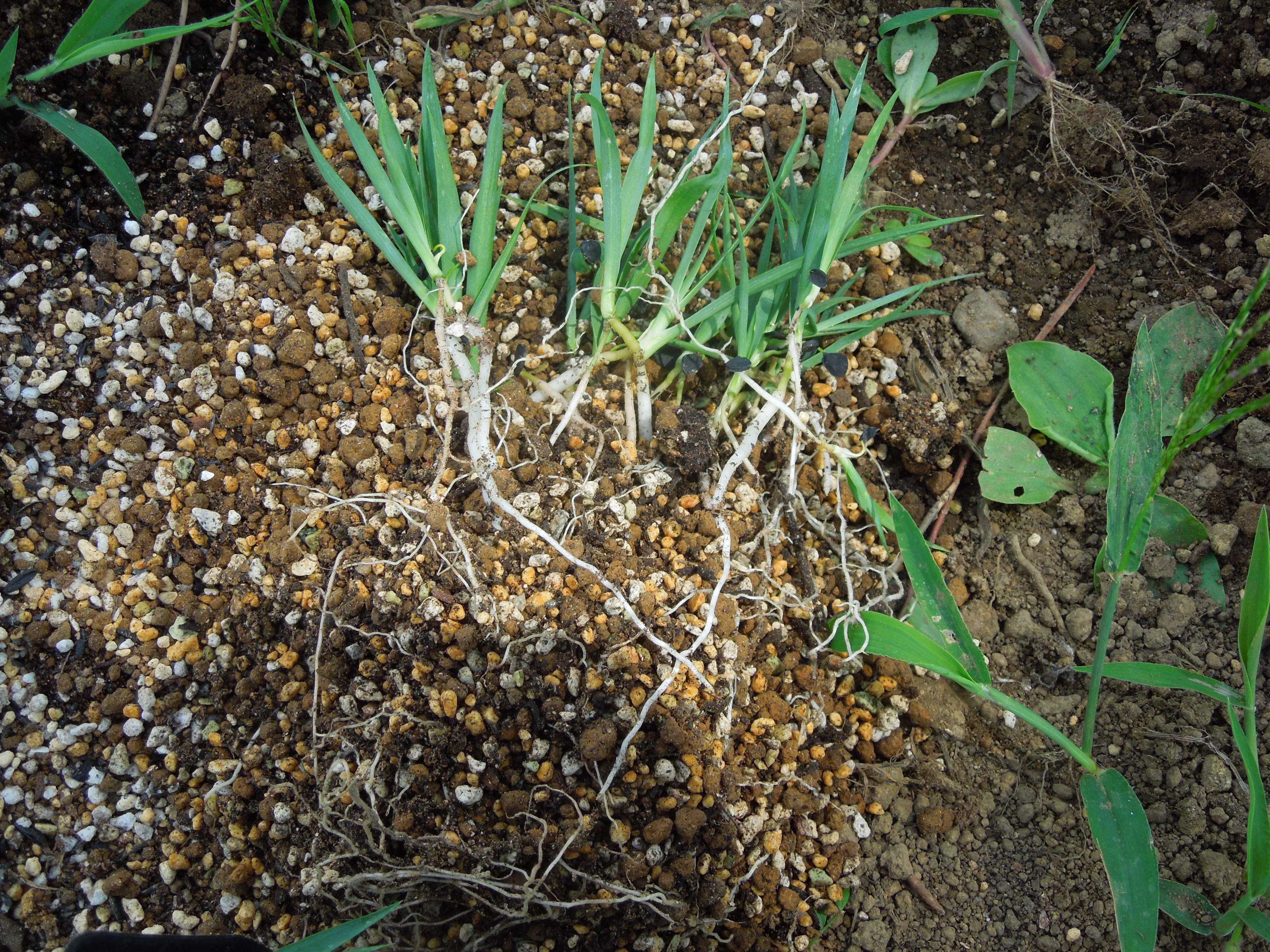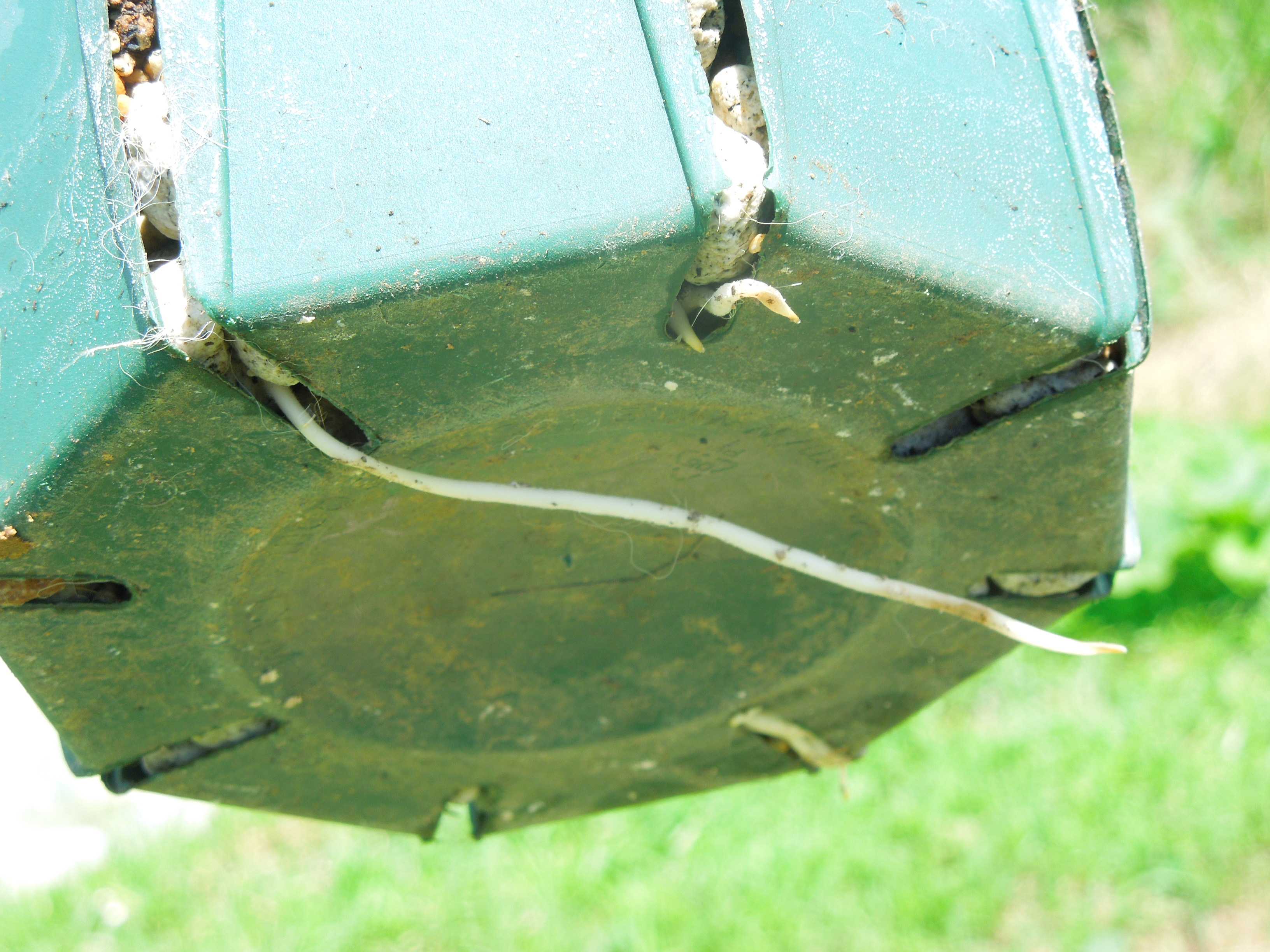 深鉢に植え付けた発芽種子が、もう鉢底から根を出していた。