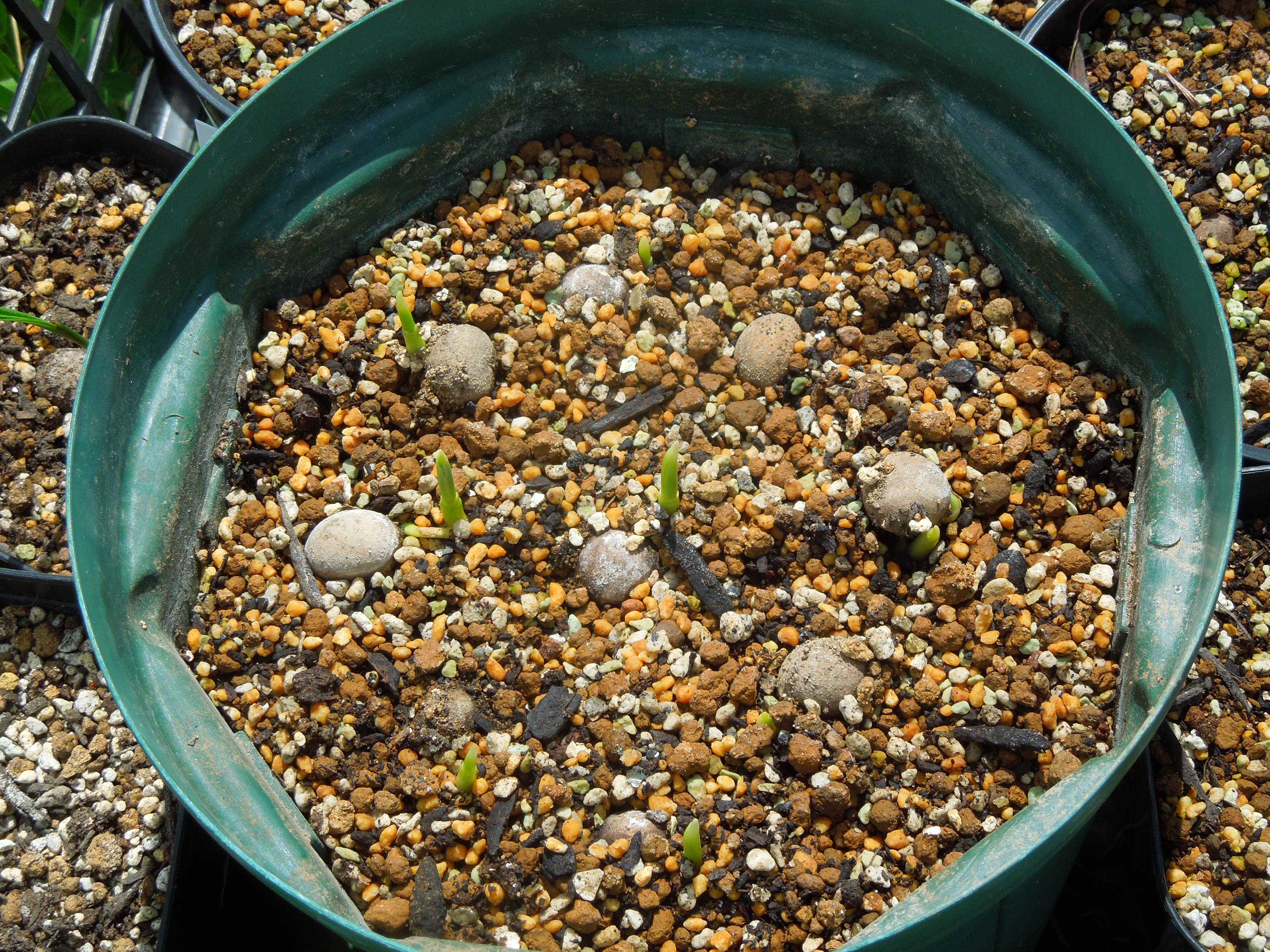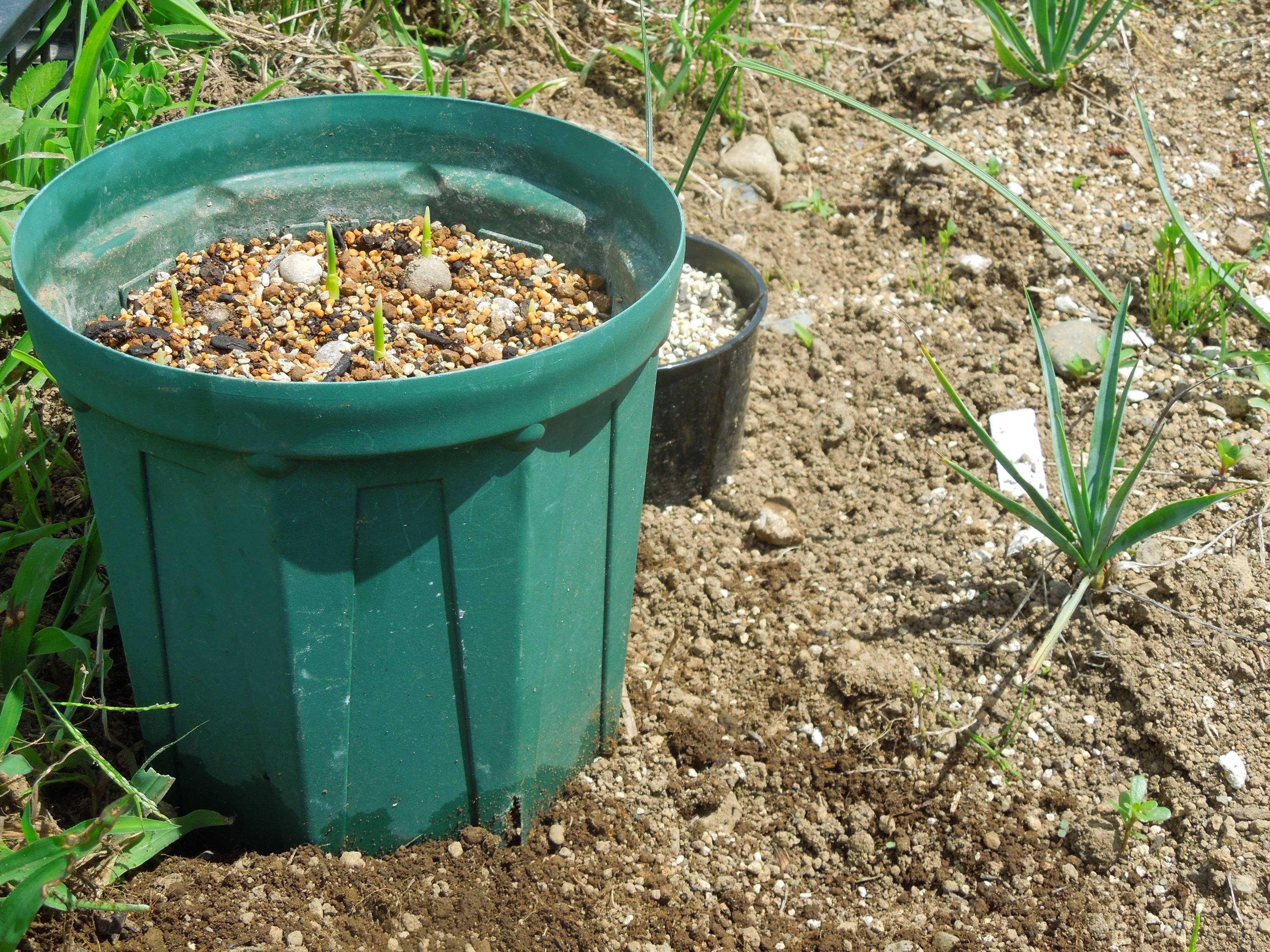 これは用土も発芽種子も多くバラすのが面倒なので、鉢のまま鉢底部分が隠れるくらいに埋めてしまった。